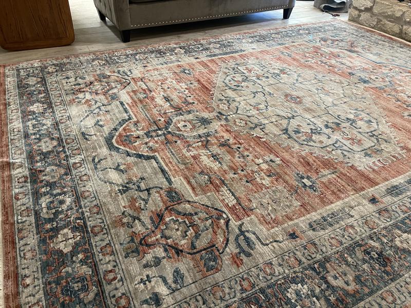 Color is one of the hardest thing to count on when you buy online. This rug, while it looks blue and rust, is mostly grey. It has varying color throughout, but has a gray tone overall.