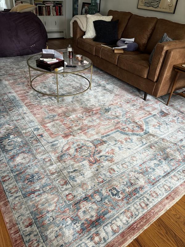 This rug is beautiful and looks so good in my neutral space. After reading the reviews I expected the coloring to be different depending on the way you look at it and that is correct. One way is lighter more coral color and the other is darker more rust. I knew that going in so I placed it down considering which coloring I wanted to see from a specific angle.