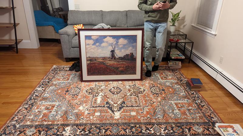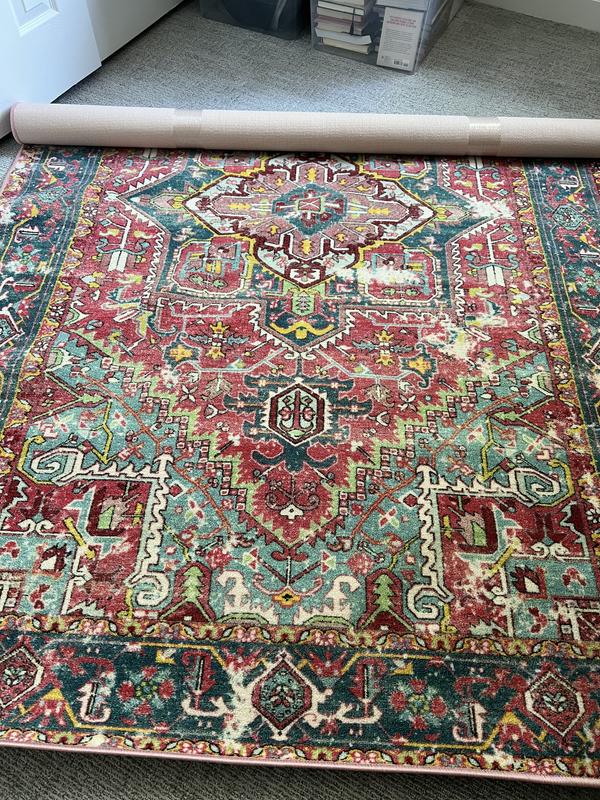 I bought this thinking I was getting a Deep Red and blue rug. What arrived was an ugly pink and greenish blue! NOTHING like the photo! I can't get it out of my house fast enough. i didn't even take it out of the packaging! I didn't even want to give it ONE star!