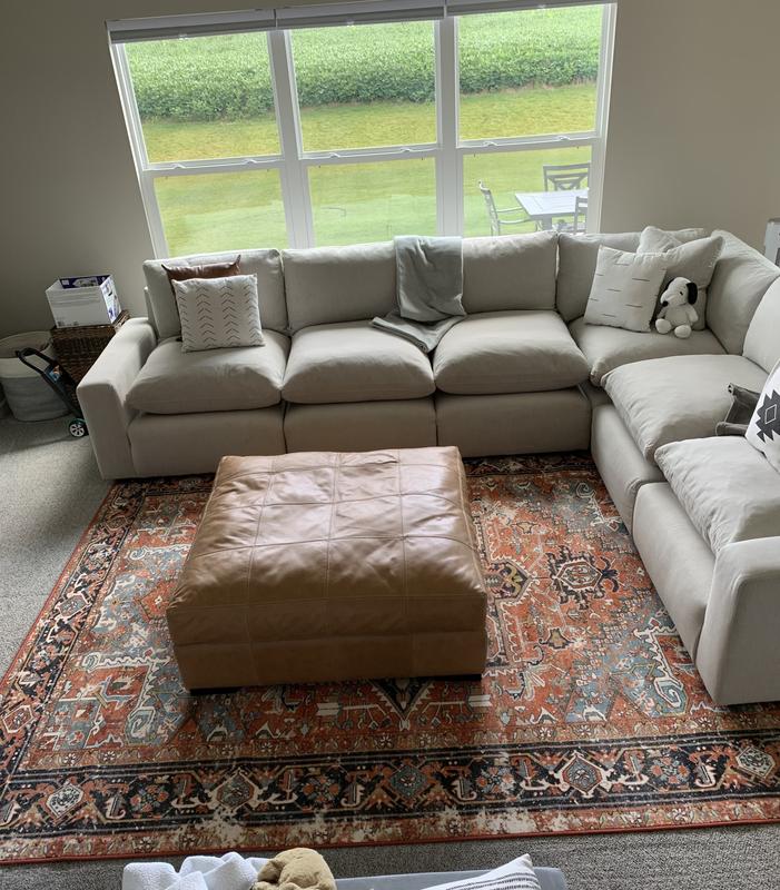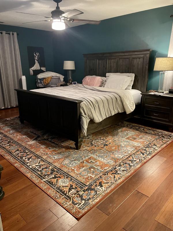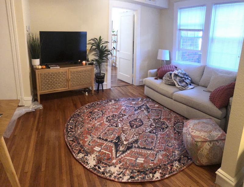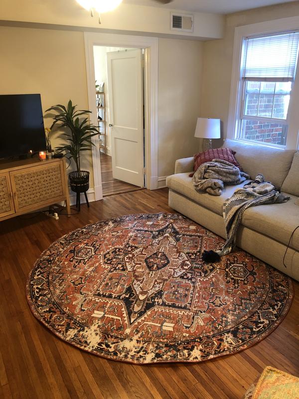 This is a gorgeous rug. It brought our living room to life with its warm tones and beautiful pattern. We’re so pleased! We have an off-white sofa, soft orange chairs and bronze & blue accents. Lovely.
