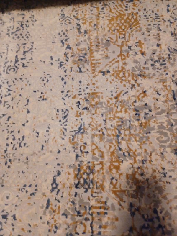 It looks different from the photo but I dont care. It's a very pretty rug. Hi low pattern with medium blues, grey and a slight touch of beige. Good quality.