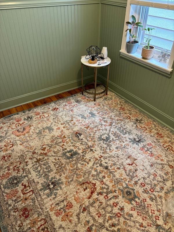 My daughter purchased this rug for her apartment.The colors are vibrant and the rug is substantial. It was packaged very well, which made for easy transport up 3 flights of stairs. We will definitely think about purchases in the future.