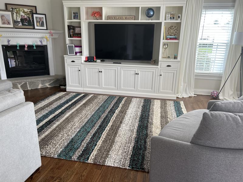 This rug is very soft and we love the colors. Note that the blue is very teal in color.