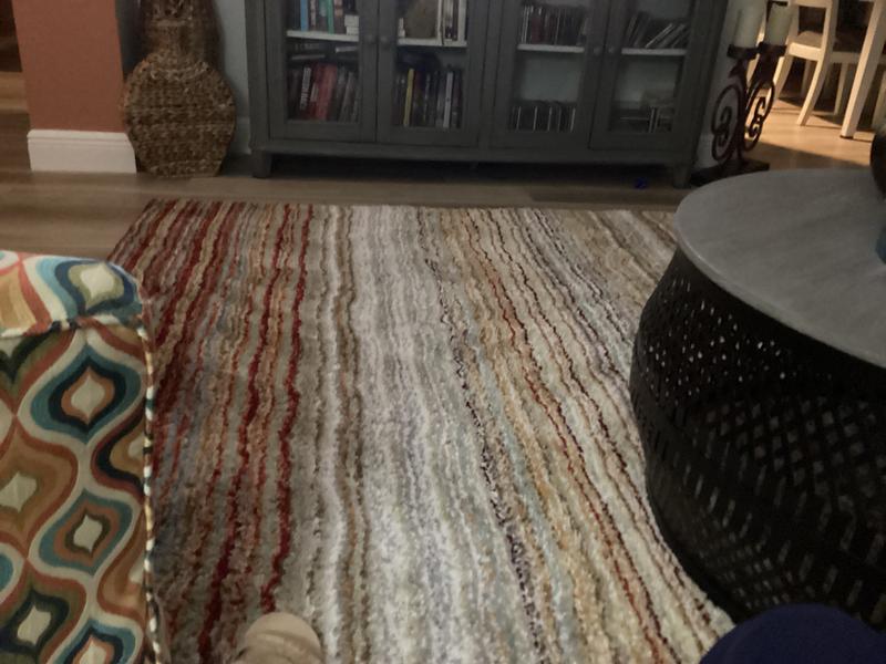 Beautiful warm and cool tones! Goes with grey, tan and brown which are my colors. So soft and comfortable I do not need a pad. It vacuums great, I could not have picked a better rug.