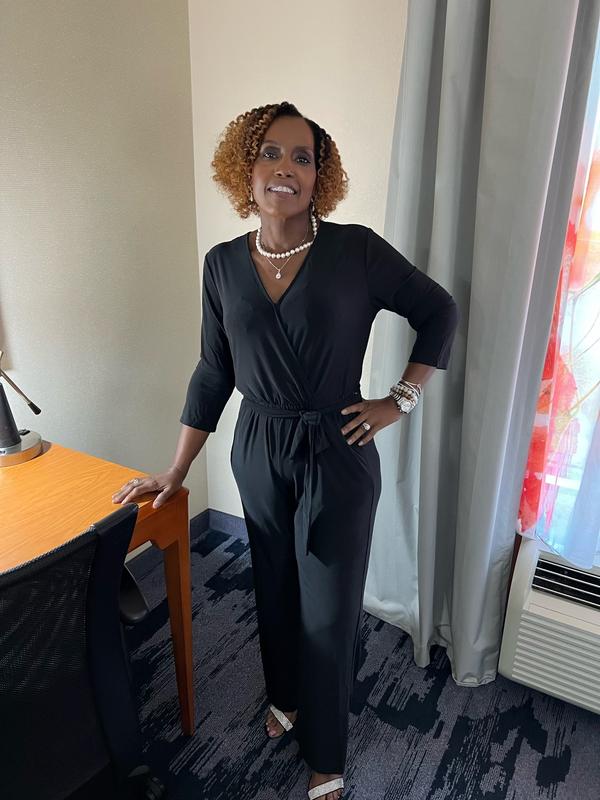 Soft and easy to put on jumpsuit. Nice hook closure for chest, but there is a gap from where the hook is to where the draping crossover ends at the waist, this can be easily solved with another hook. I am 5’4” and with a small heel the length is fine. The legs are not to wide. I am pleased as it will be a travel staple.