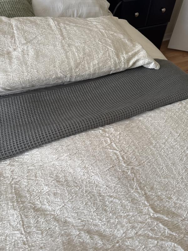 I am so pleased with this duvet set. The color, a light cream, and the texture give it an organic, airy feeling. It is made of 100% cotton, so it will be perfect when the weather starts to warm up. I love that the cover easily can be removed from the quilt inside for washing. This feature also makes it convenient for using different weights of quilts inside to correspond to the temperature. The set looks great on my bed!