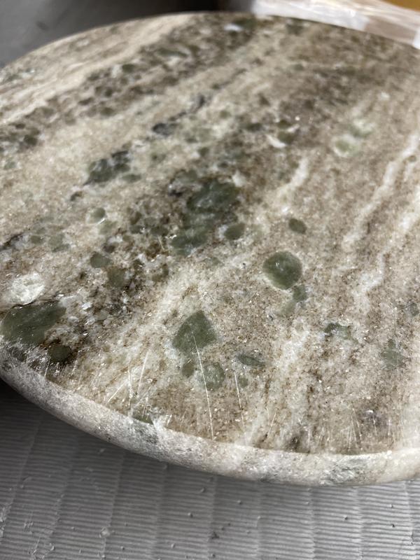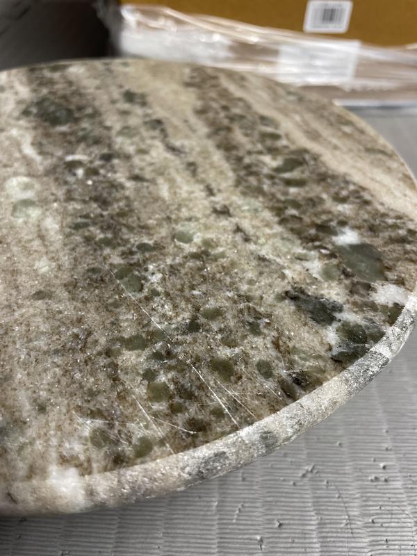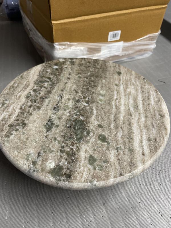 I bought the board and the cake stand. Both are not like the photos on website. The color I received is grayish/brown w/green spots. Looks like a return as it has scratches or cuts all around. I wish you would check return items before reselling them! Weight and size are nice though. Disappointed, will return.