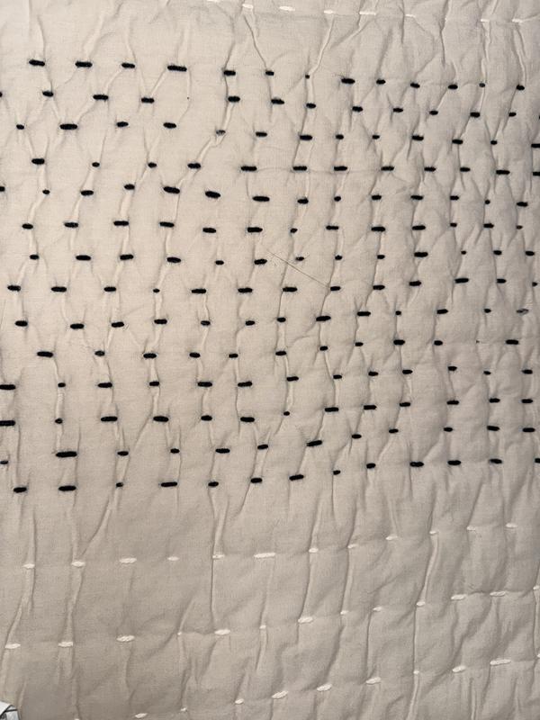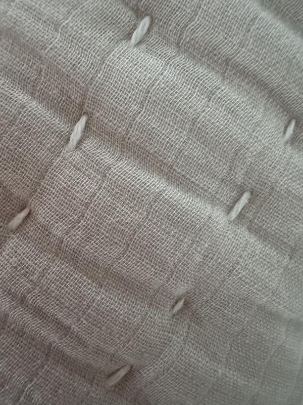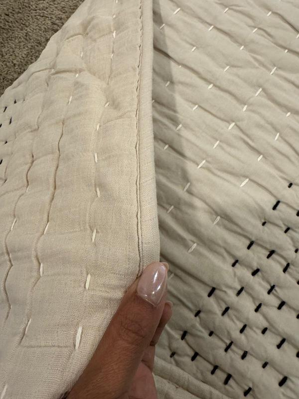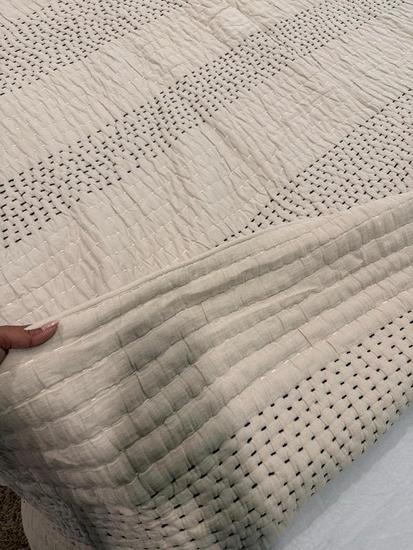 This coverlet is thin but really warm. I like that it is all cotton and breathable. The black and white stitches that are sewn throughout are just enought to brake up the solid beige. Very happy with the quality of it.