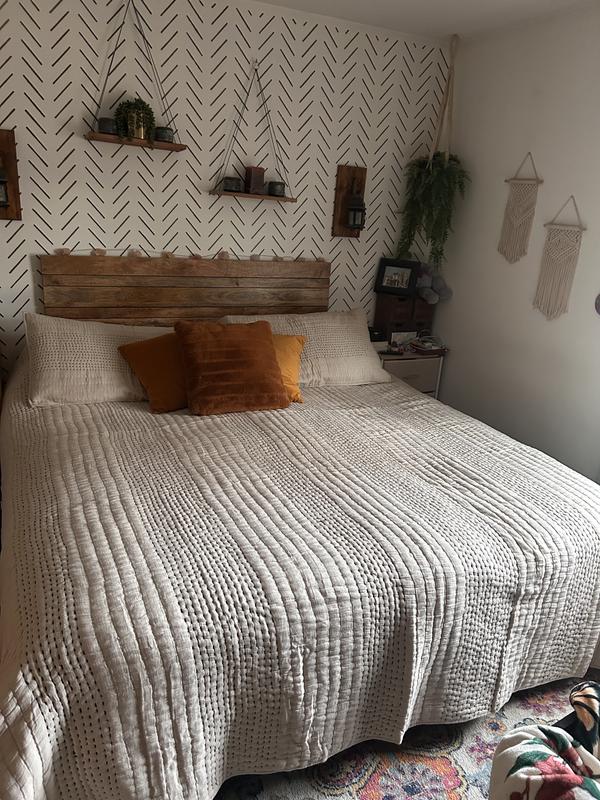 This comforter is simple, cozy, and effortlessly stylish. I love the neutral color and subtle stitching . Made of 100% cotton it is soft, drapes nicely and holds its shape well. I got a full/queen and it fits my queen bed perfectly. It is warm without being too heavy, making it great for year-round use. Very happy with this comforter!