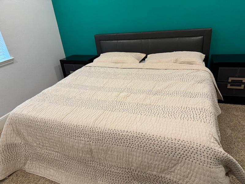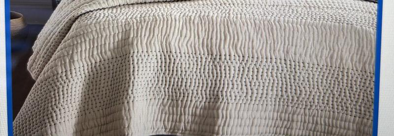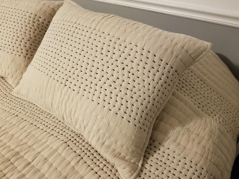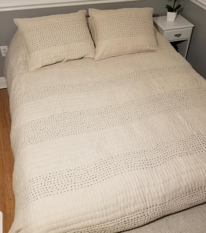 This coverlet looks great in my guest bedroom. The neutral light color and matching pillow shams are composed of high quality material and it has a designer appeal. I am very pleased with the weight, color and detailed stitching.