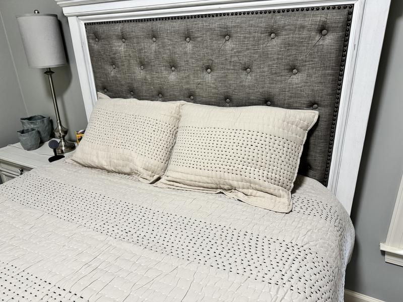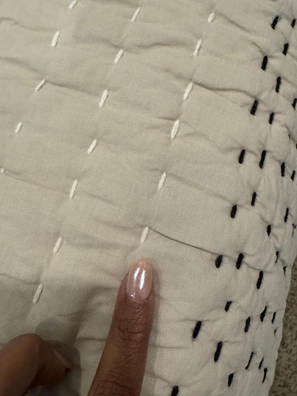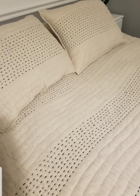 I love this coverlet! The fabric is pretty and durable as I do have pets so it doesn’t snag easily. The color is very neutral and warm with nice chocolate brown stitch details to break up the linen tones. I get a lot of compliments from family and friends.
