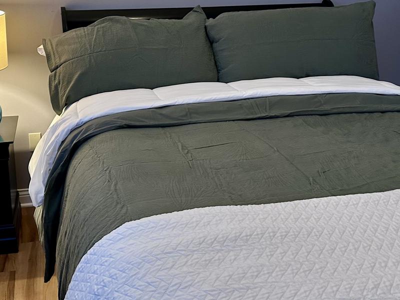 Beauty texture grey/green duvet cover with pillow shams. Easy to layer for extra inviting warmth and comfort to your bedroom. The outside material is a textured heavier material where as the underside of the duvet is thin with more shein without texture. The duvet has buttons as the closure while the shams have overlapping more envelope like closure.