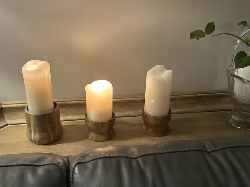 Like the wood, made in India. Works for 3" wide candles, not 4" which I do have a lot of, oh well. Ni cely made.