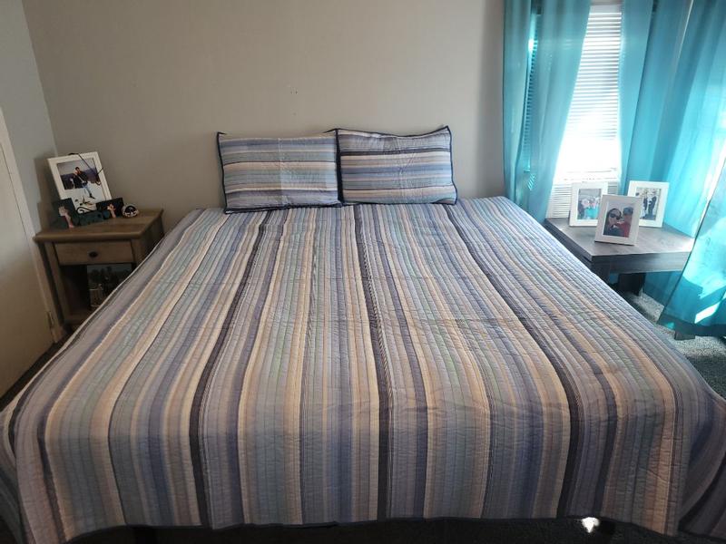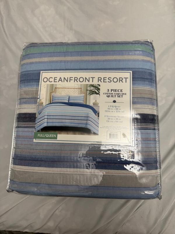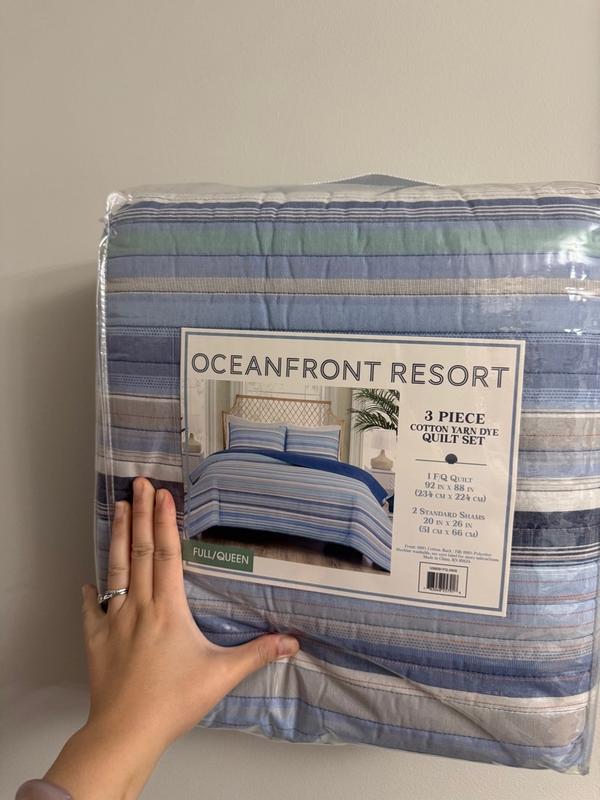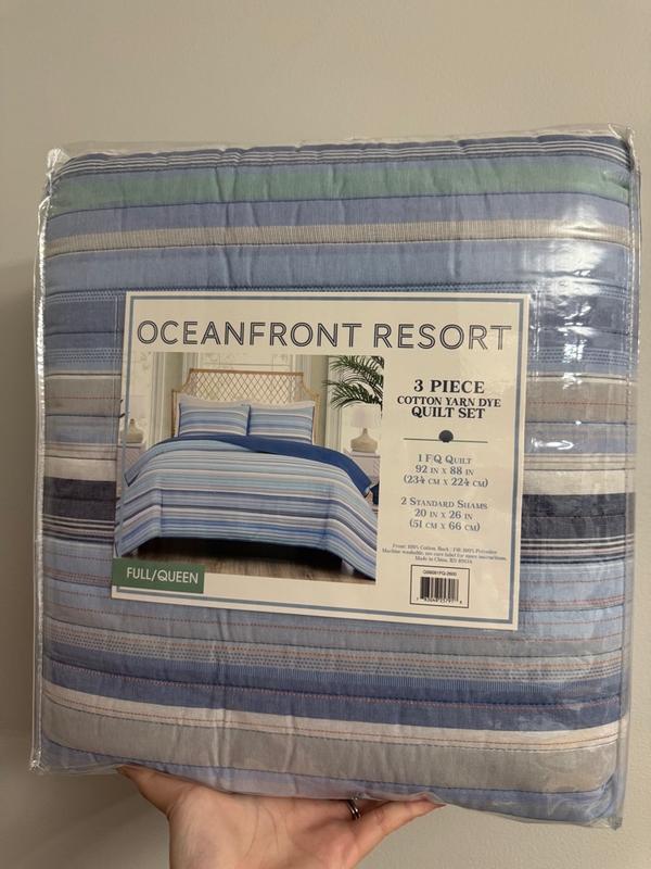 Love it! I finally found a quilt that's perfectly warm and lightweight. The quilt fits my queen size bed perfectly, the 2 shams enhance the whole look. It actually appears and feels like something that would be found at a hotel resort. It brightened up my whole bedroom with its blue color and stripe design. I like that the quilt could be reversed to either the striped or solid dark blue side. The material of the quilt is soft and durable, it washes well and dries quickly in the dryer. The Oceanfront Resort Quilt Set is a great choice for those looking for a lightweight yet warm quilt.