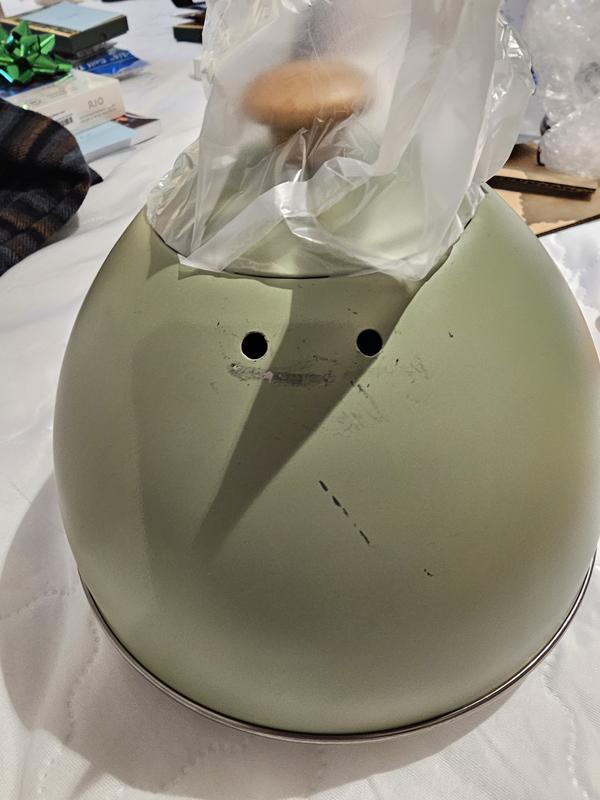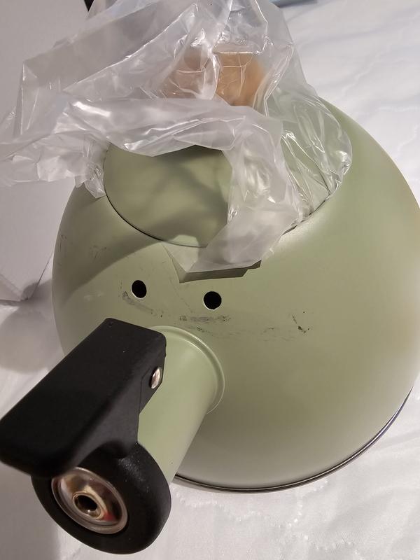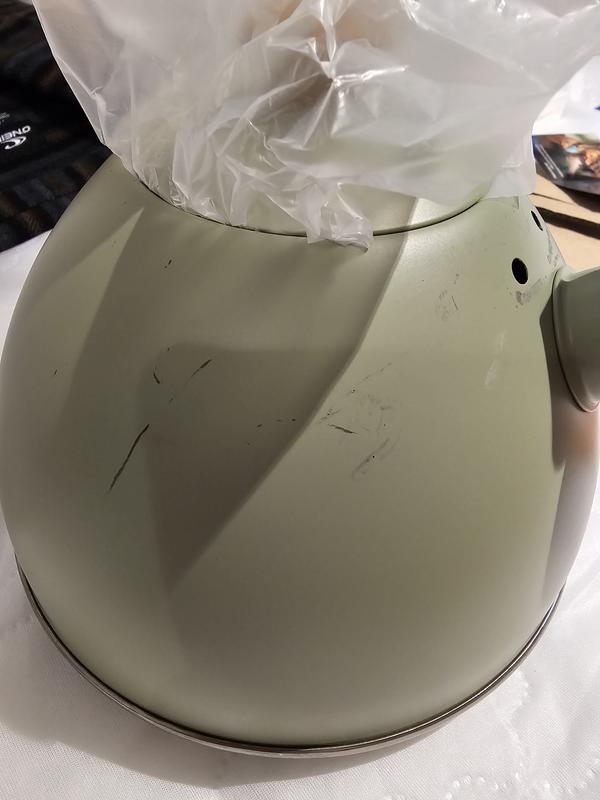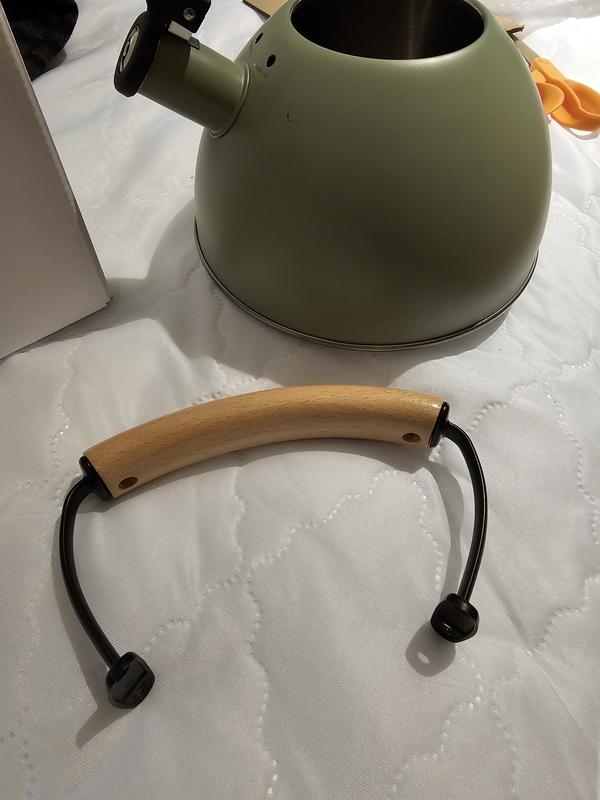 I was concerned when the package arrived and I could here rattling. The handle was detached and had scratched the kettle all over. The handle is held on by 4 screws with nuts, so it did not come apart during shipping. The nuts were inside the kettle and only 1 screw was in the box. Bad job, Macy's!