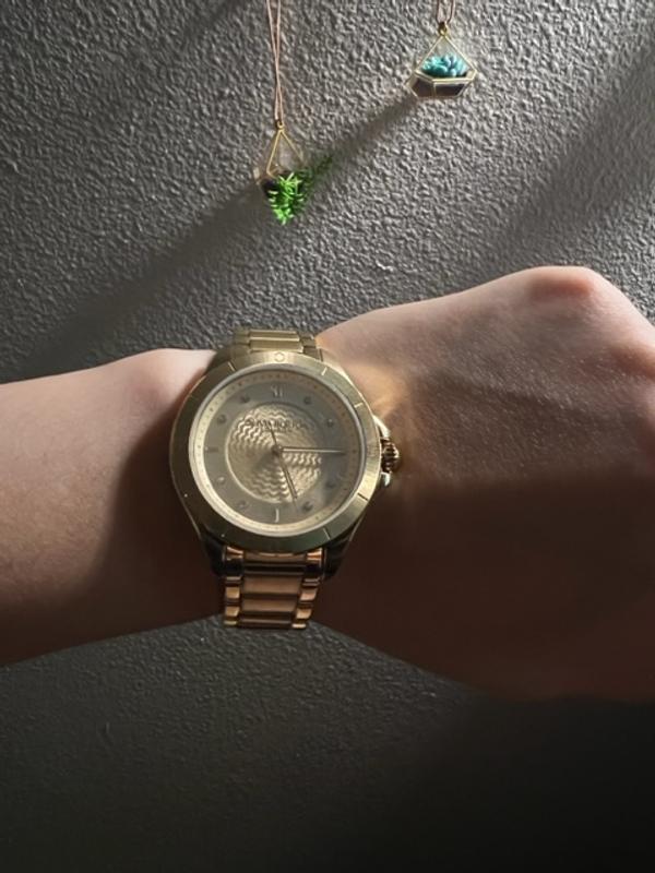 I really like how stylish and feminine it looks but yet it has that sporty feel as well making it a perfect visually balanced watch! I have been able to accessorize it with every day wear and also wear it when I dress up. I also like that it’s heavy enough because if the great quality but it’s also light on my wrist. Another great detail is that it’s water proof…love that! I’ve also received many compliments on my watch on how beautiful it is! I’m definitely happy with this watch!