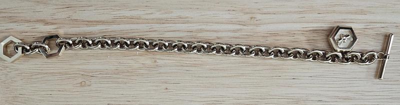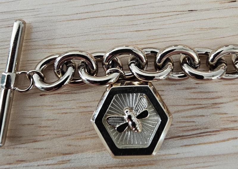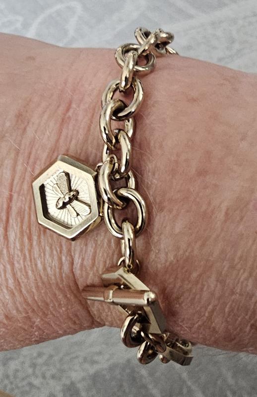 This is a beautiful gold bracelet that goes with just about everything-sporty or dressy. I live alone so I very much appreciate the fact that I can put it on by myself. There are two areas to secure it. I would prefer to use the one that would make it smaller but I can’t get the gold piece in that one. I use the larger one and the bracelet has never fallen off. I love the little bee on mine.