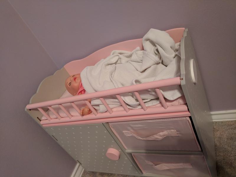 I received this doll crib set for my daughter for her American Girl Dolls or the knock off brands and it has been perfect for them. It was very easy to assemble without a lot of issues. The 18in dolls fit perfectly on the crib and the drawers are awesome to keep all the little accessories in place without losing them.