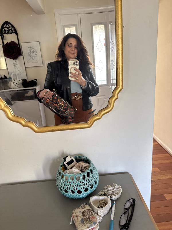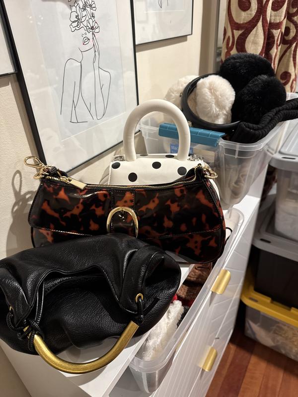 Love this little purse. The tortoise shell covering is so pretty. I do wish it had a pleat at the corners to hold a little more like your leopard one. It has a shoulder strap that matches to make a great crossbows, or just use the handle for a dressier look. I love this with my faux suede pants & tortoise earrings. Unique purse!!