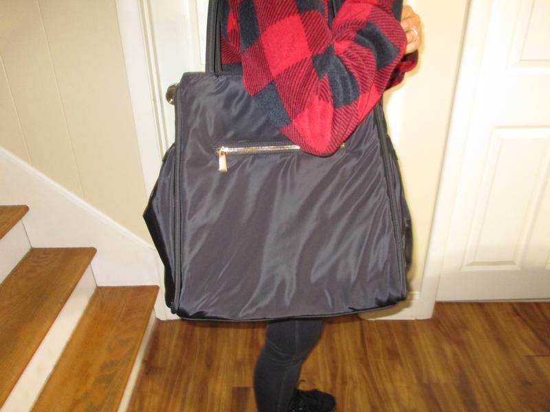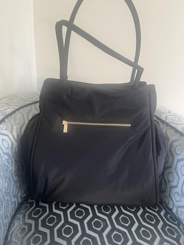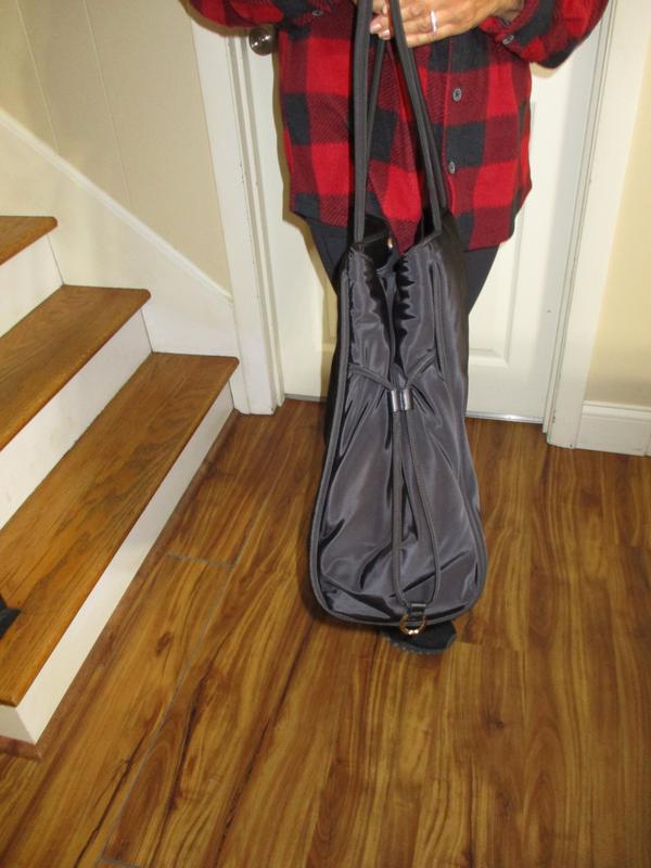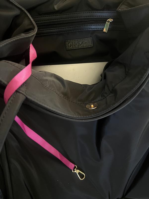 On 34th Jyyll Large Solid Nylon Tote in Black Lightweight large nylon tote that can be used as an everyday staple and beyond; versatile piece to add to your wardrobe, it will hold all of your daily essentials and more whether you are traveling, going to work, shopping, the gym. The uses are endless! The inside of the tote has one large main compartment that closes with a magnetic snap closure. There is a zipper pocket on the inside back wall, a lanyard to attach keys or other items, and two slip-in pockets to hold your phone, glasses, etc. There is also an outside zipper pocket. The bag has two handles that comfortably fit over your shoulder. The hardware is gold-tone. There are adjustments on either side of the tote. The fabric is a textile material. Overall, a useful large tote bag that you cannot go wrong with. I am currently using it as a work bag and for the gym/yoga; I toss in my wallet, phone, car key, snacks, lunch, and water bottle for work; for the gym or yoga, I add my towel, workout gloves and a yoga block. Go for it!