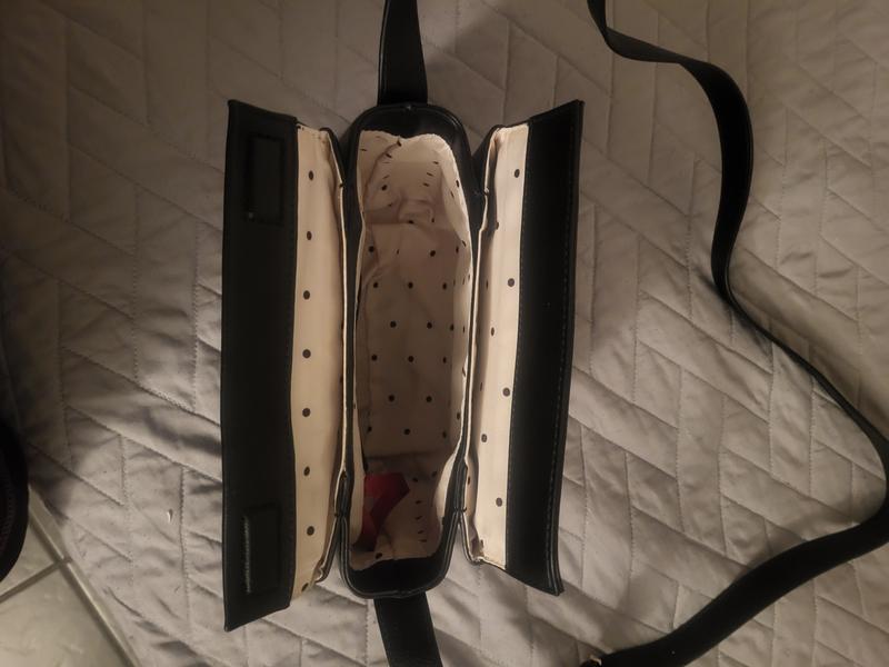 I love the two color on this purse, I love the way it opens and I love that there are no pockets inside. Pockets, when filled, get in the way or when these are empty they stick out and are in the way. So without pockets you have a direct shot into the purse. Now, for what I do not like; there is an outside zippered pocket and the usual inside zippered compartment but these do not hold much. It also has a key keeper inside like the more expensive purses. I wanted a smaller purse and this is smaller but I can never seem to find exactly the size I want with all the other things I’m looking for. Also, the magnet that holds the purse closed could possibly be stronger because when you put enough things in the purse it doesn’t want to hold together as easy as when empty. I like this bag and will most likely keep.