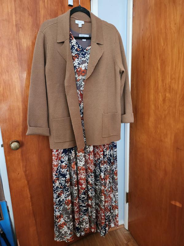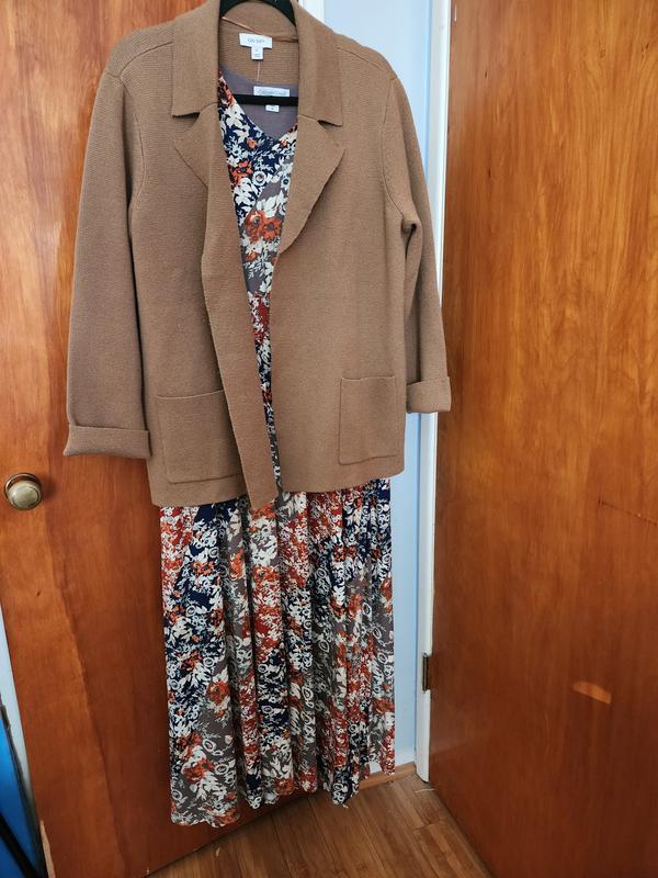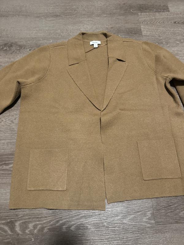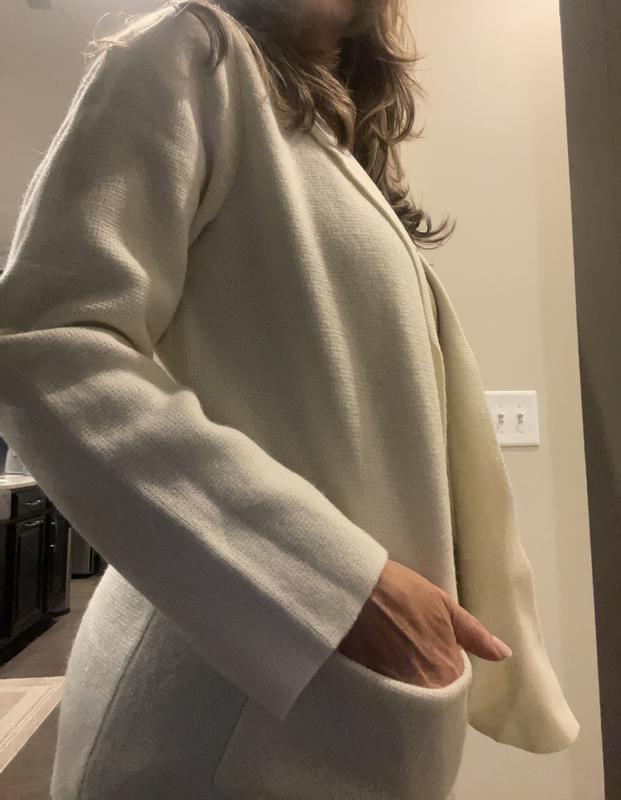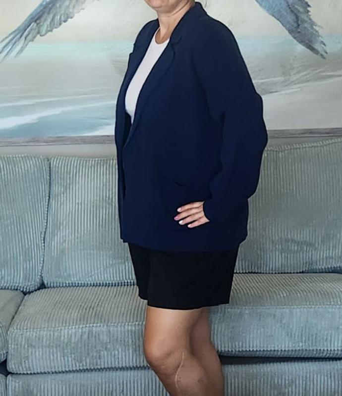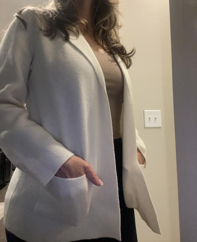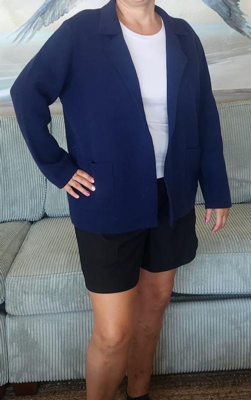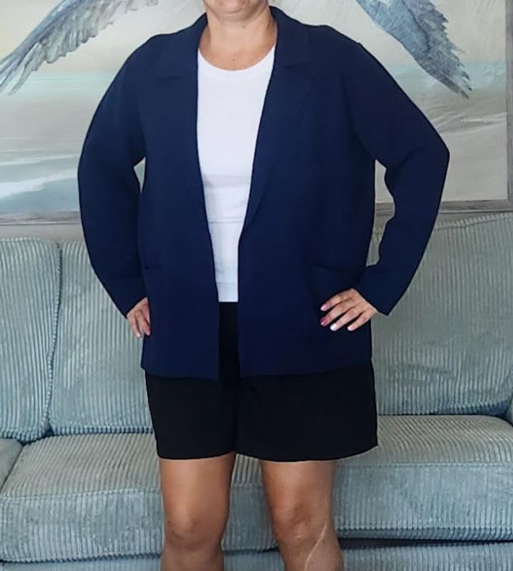 Sometimes you just need a black sweater and this fit the bill. The sale price also made it appealing. It's described as a Sweater/Blazer, which is accurate. The size (I ordered a Small) is also accurate. I like the collar, pockets, length and flattering drape. It washes well. Because of the length and dense knit, it has a little weight to it, but that is less noticeable once you're wearing it. I expect to get good use out of this top.