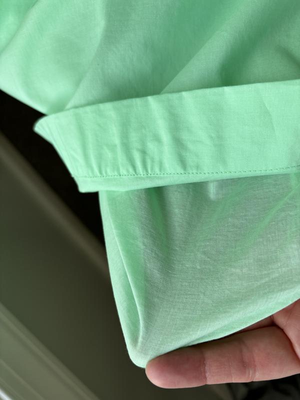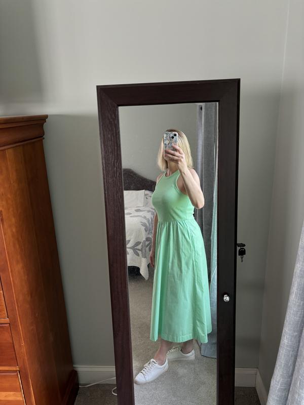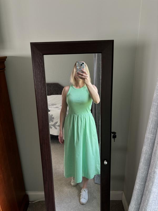 This is a cute, comfortable dress, and I like that it is cotton. Easy wash and dry. The mint color is lovely and refreshing for warm days! My husband loves it on me.