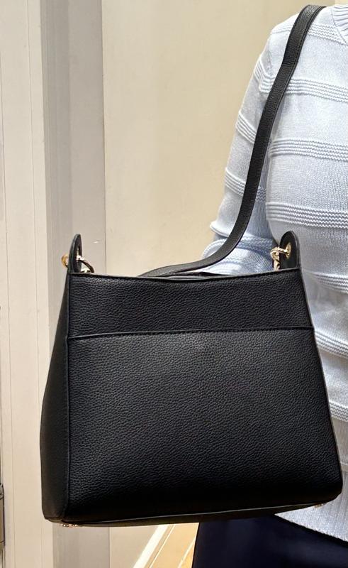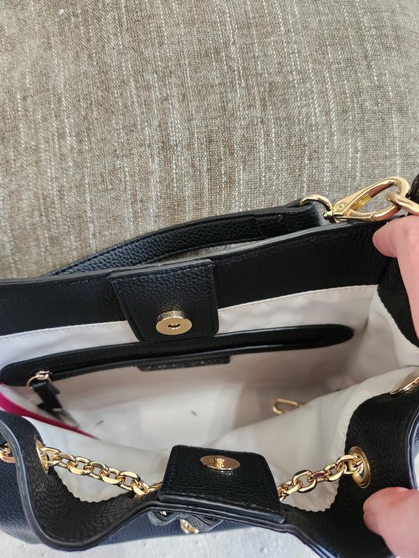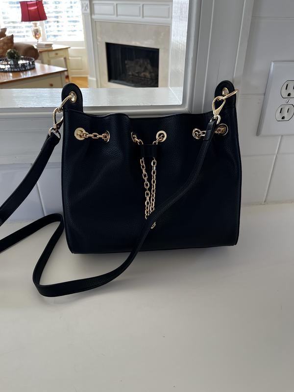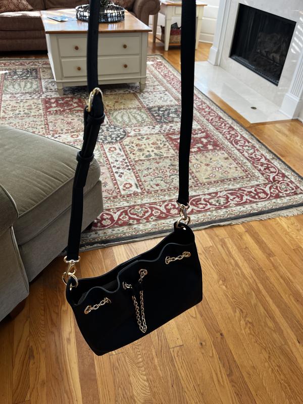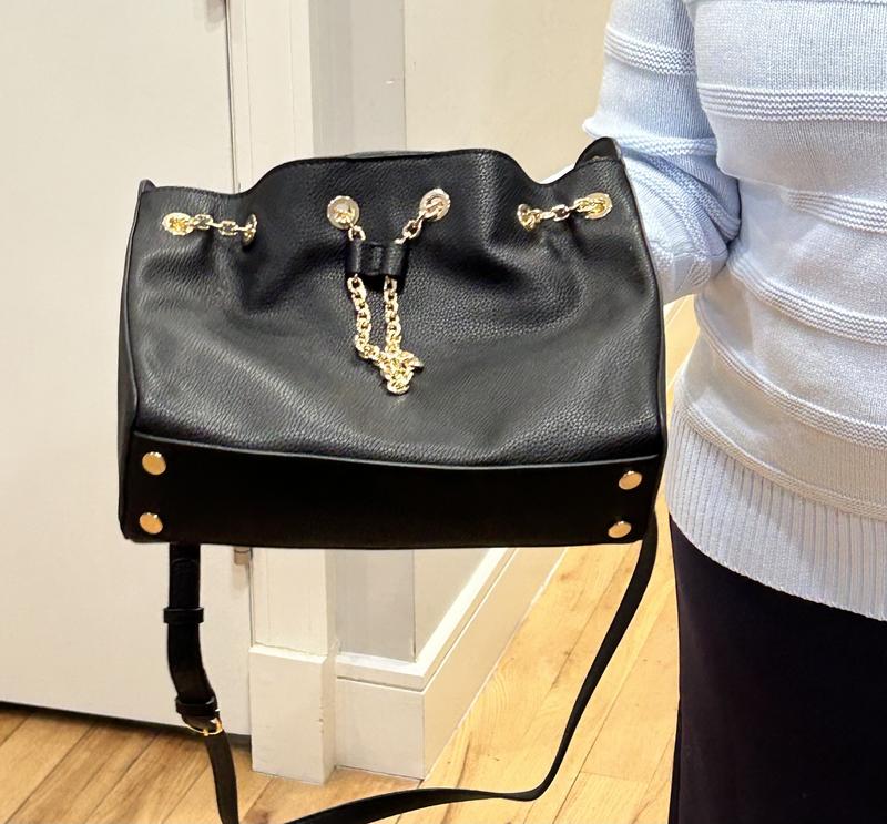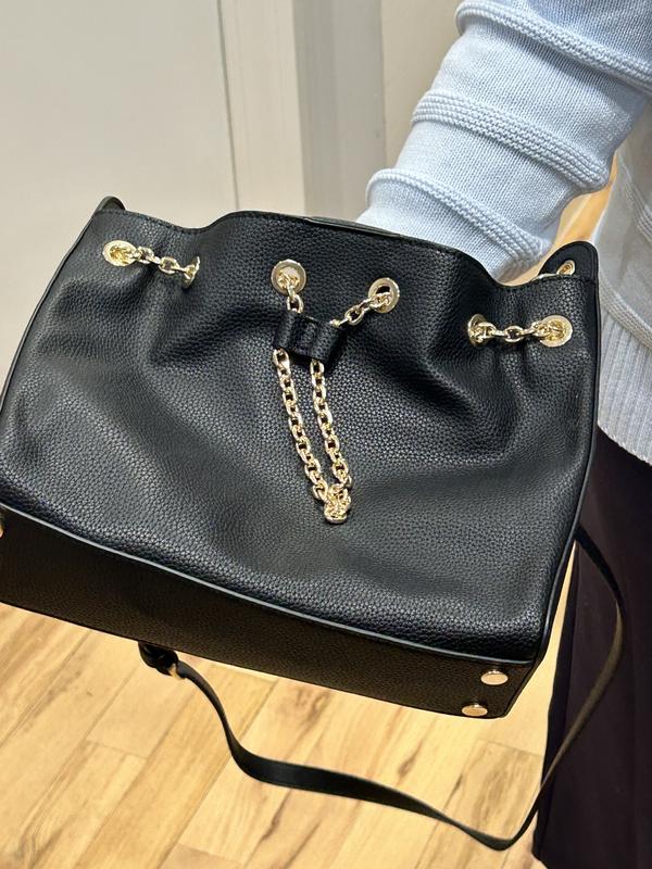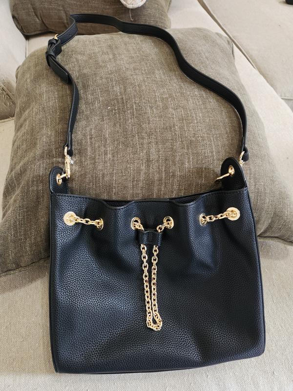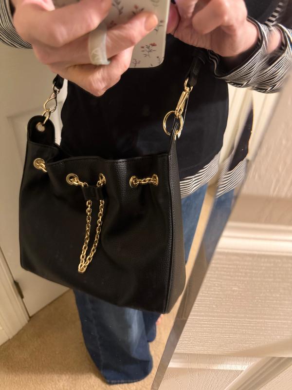 Super cute crossbody with gold chain strap. The gold chain strap gives the bag a modern feel while still allowing for easy access into the bag. I do wish the bag had a shorter shoulder strap as well but I will add my own. This bag is similar to a bucket bag style but more narrow. Holds a lot for a compact silhouette. Recommend!