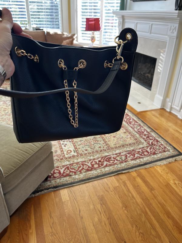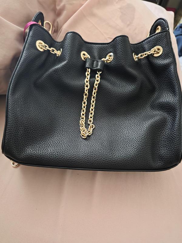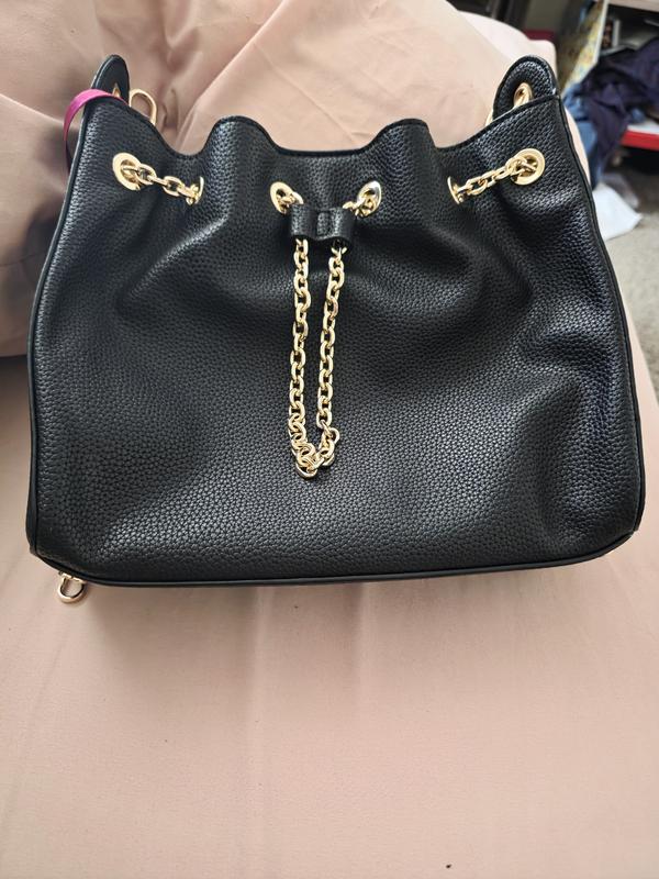 This is a small size light weight bag. The material consist of Polyethurane and Polyester. It has a 40.75” removable strap. It has gold color hardware includes small holes that allows for a drawstring closure closure. There is also a magnetic closure inside. The back of the bag has a pocket and another pocket is inside. The bag has a pebble like surface. The bag is a nice matte black and is a desirable size especially when a purse won’t do and you don’t want an oversized tote.The outside pocket is a bonus since it can hold important items at reach. The material does not look rich or authentic. The hardware is bright and appears gordy against the matte black surface. The gold color drawstring chain overwhelms the small bag. The strap appears way to long although it is adjustable and removable since the bag is too dressy and decorative to be a cross body. This bag is not appealing to me due to the synthetic look material and loud hardware.