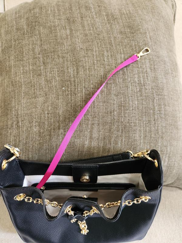 The purse us very nice and stylish. I really like the gold chain accent and it has a strap inside with a hook to secure keys or a wallet. The material is nice with a large side pocket. It has a versatile look and would like nice with any outfit or occasion.