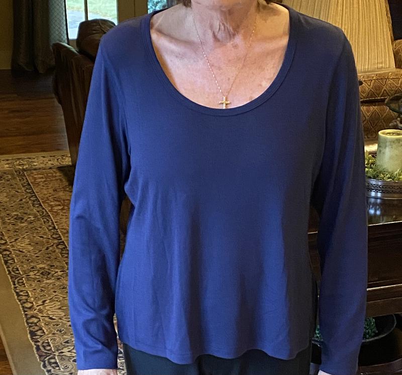 This shirt is a big disappointment - way shorter than it appears in the photo and made of a slimy feeling fabric. It is going back to the store this weekend.