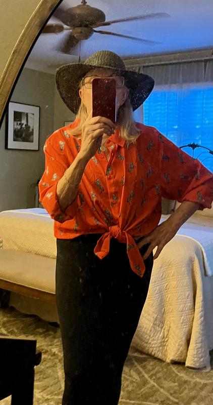 This is a nice silk blouse to wear alone or under a sweater. It is well constructed and fits the body with a relaxed fit. The orange is very vibrant and is complimented with black and white zebras for contrast.