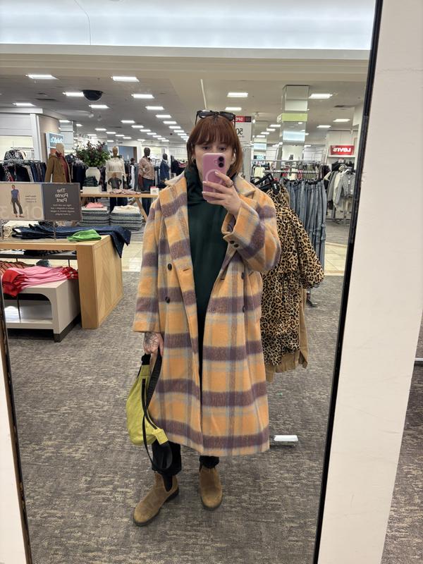 Looove this coat! I’d say it runs slightly big but I don’t mind that so much for a dress inter coat. I can comfortably wear thick sweaters underneath. I get so many compliments on it and it’s so fun compared to the typical wool coat on the market right now.