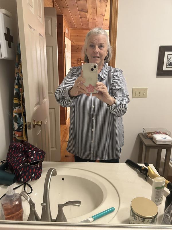 I purchased the white and olive green striped blouse and was happy to see that it is exactly as imaged. The silky material is good quality and makes me feel a little more dressed up to feel pretty in with jeans. I usually wear an extra large, and the blouse ran a little long in the sleeves and a little wide. However, roll up the sleeves and tucked in, it's great!