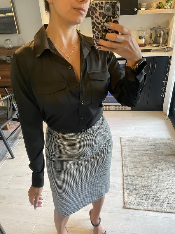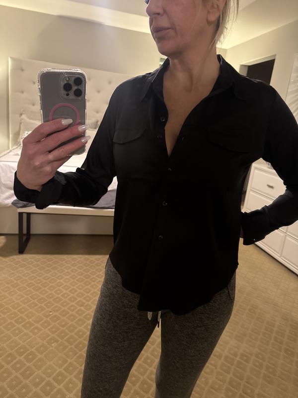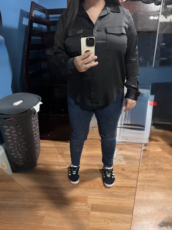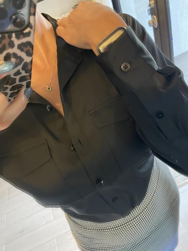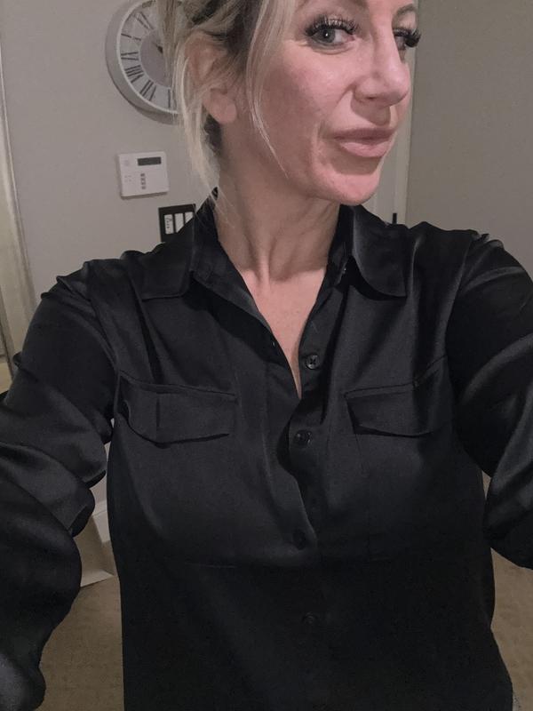 5 stars for not-too-shiny satin fabric. This blouse is lightweight (not real satin) and has a medium satin sheen that doesn't look cheap. The blouse is well sewn with pockets that lay flat, nice pleats in back, and is true to size and not too long. The second button in front hits perfectly for leaving open without overexposure. I like everything except the colors are not as pictured. 4 stars for the colors. I think I got a bad batch of the the black satin, because no other reviews mention this, but the black I received is definitely a blackish dark brown color, not true black. And the pink is very lavender pink, not a true light pink. Otherwise, a pretty blouse.