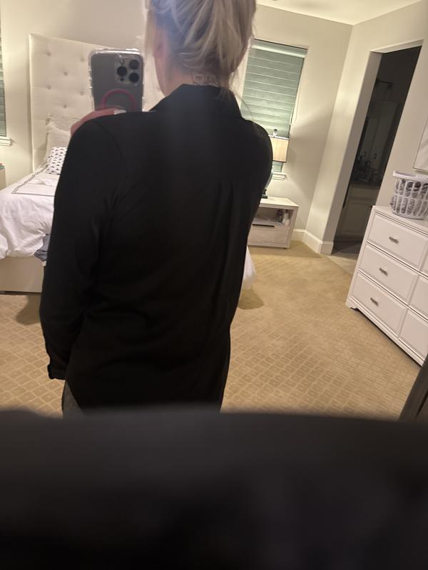 The fabric on this blouse is nice and the construction is well done. The pockets lay flat in front and there is a three fold plat in the back that makes it look more tailored. I’m 5 foot eight and a size 14/16 in tops and the XL fits well. There is no gaping at the bust, and the second button is placed right where it should be, low but not so low that you can’t wear it open. Perfect. The length is not too long, it looks good tucked or untucked. My only complaint is the pink color is shown more as a light pink or an icy pink in the picture, but it is definitely a lavender pink in person.