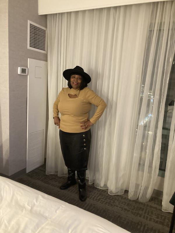 I love this sweater! Sizing is perfect and the orange outline with cheetah print is a perfect pairing.