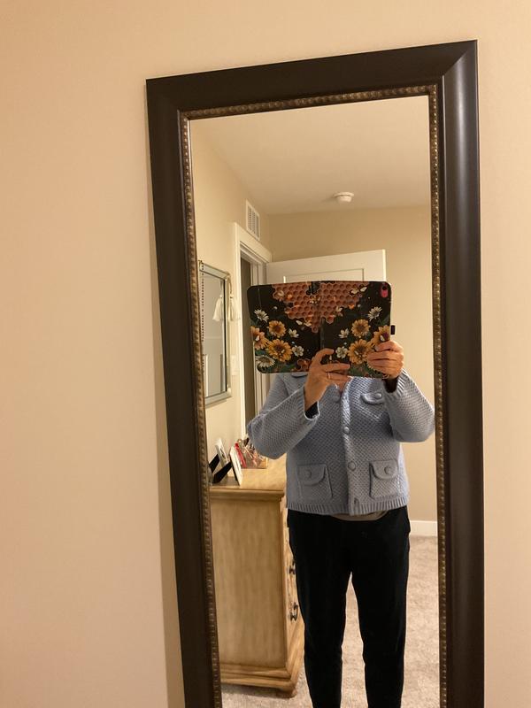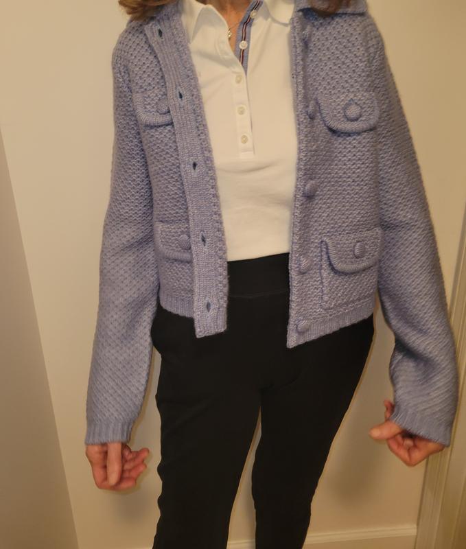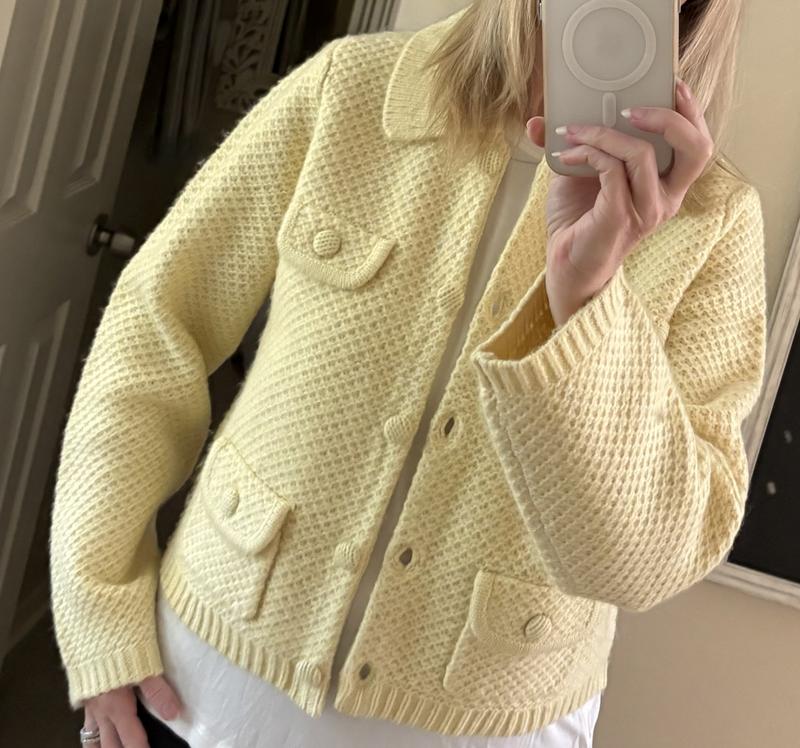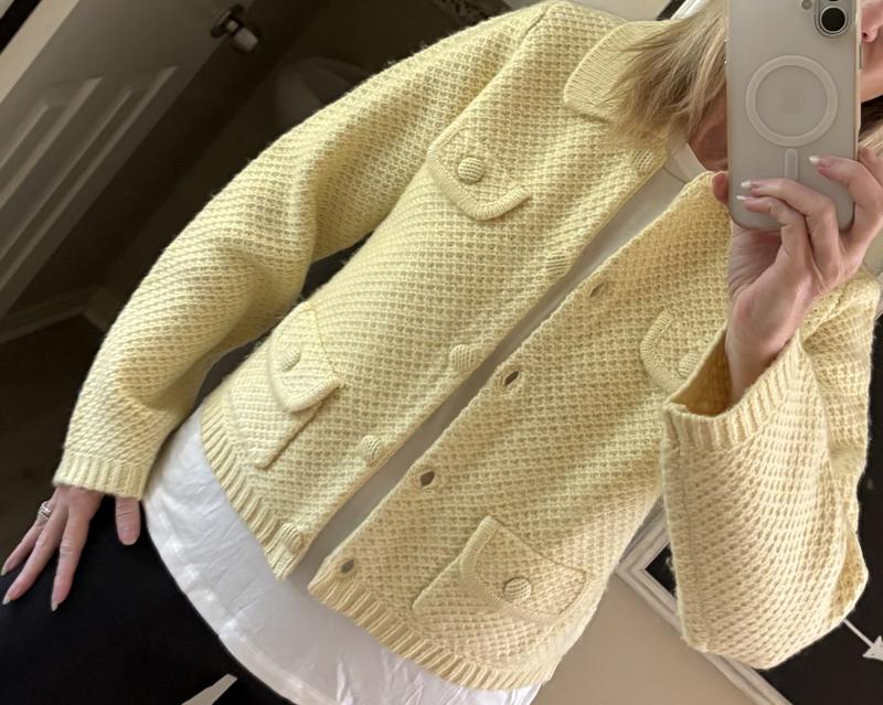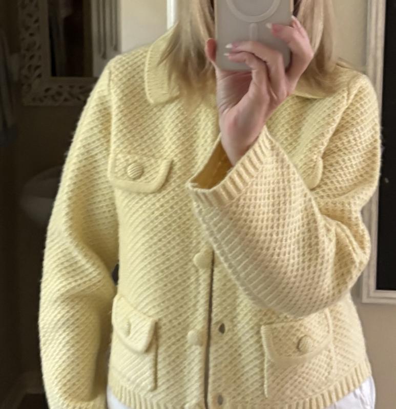 This shorter length sweater jacket has a structured look that can dress up any outfit, whether you’re wearing jeans, slacks a skirt or dress. It would be great over short sleeves or sleeveless dress. The top pockets are decorative only. The yellow option is a very soft yellow.