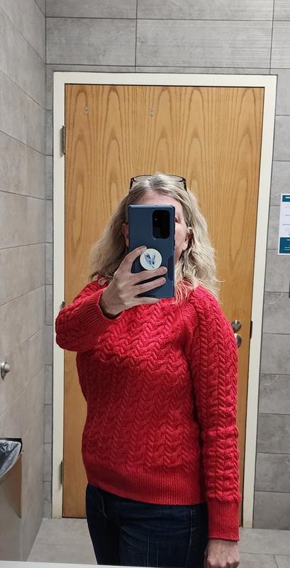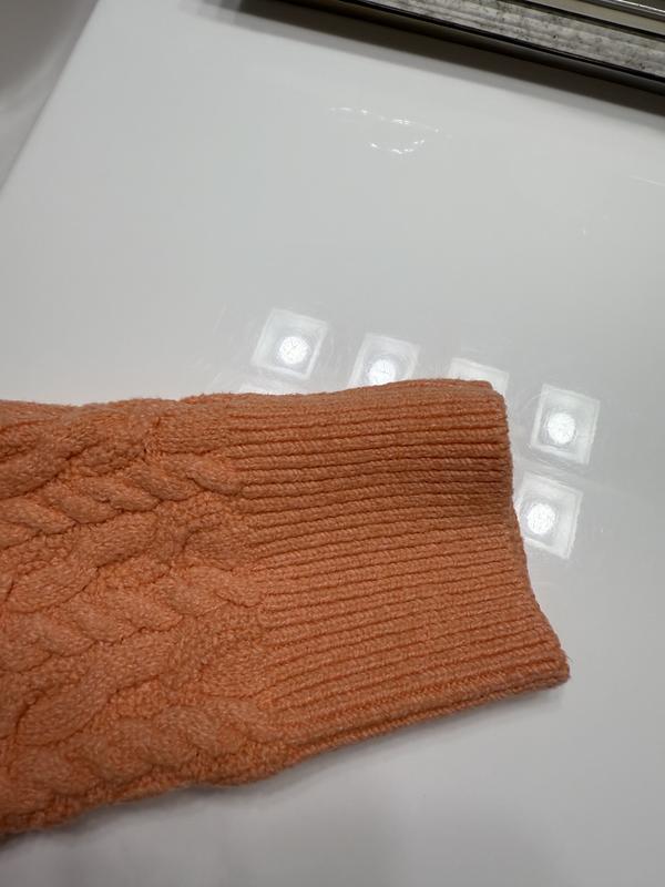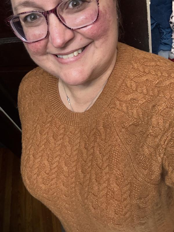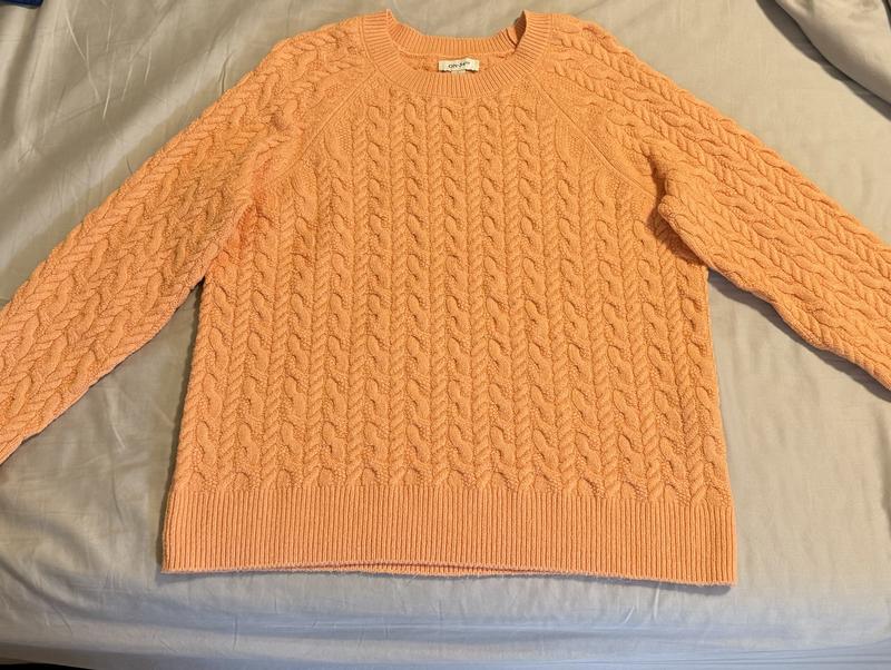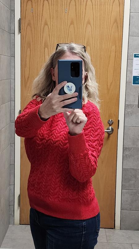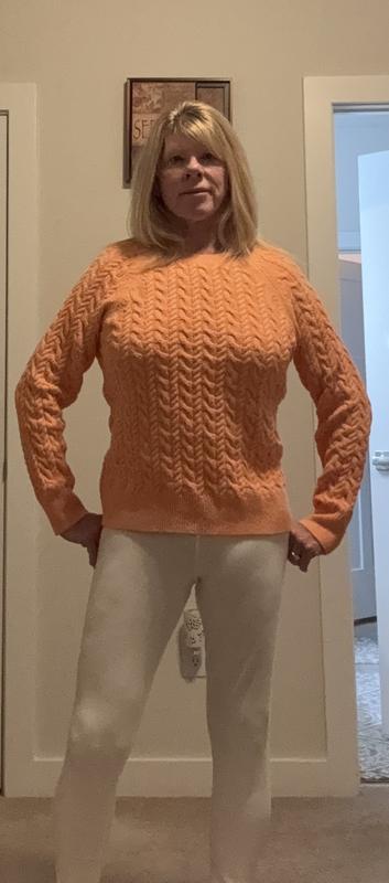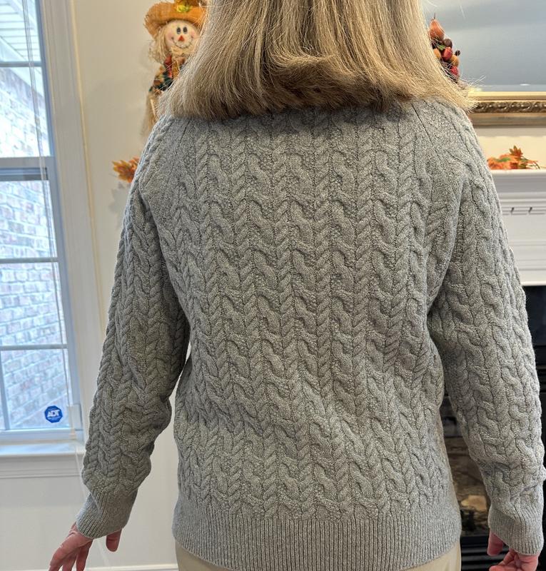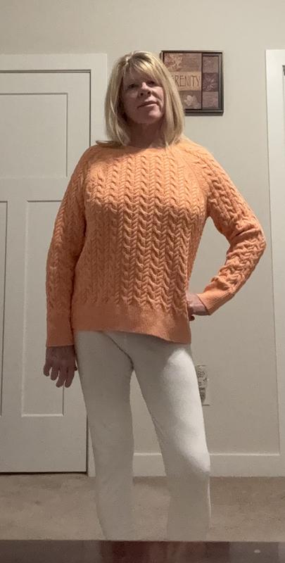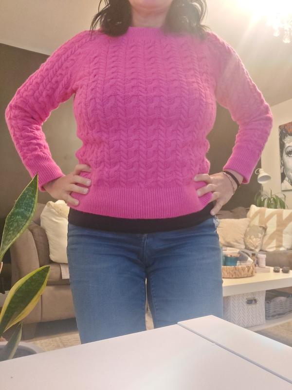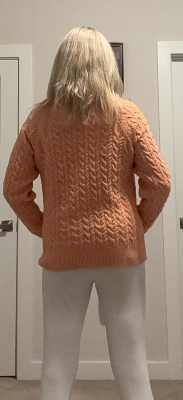 This is a great sweater. It’s sort of a conservative sweater but it’s well-made and should last a while. I really like the pink color and cable knit design.