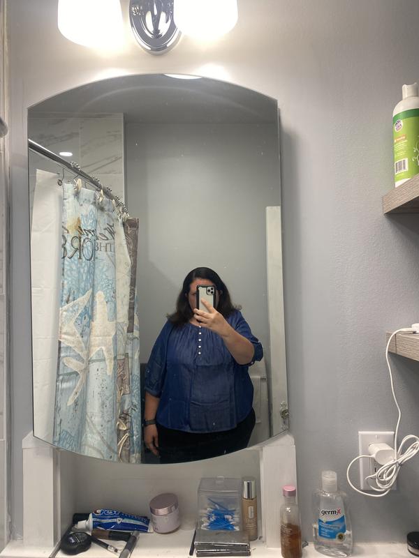 This chambray style, blue shirt is absolutely beautiful in person. The material is light, soft, and breathable. It's a great addition to your spring and summer clothing. Matched with a mid-length or longer pleated skirt, this shirt is eye-catching because it brings out the rich blue color. Also, add a solid colored floppy or wide brim hat to complete the outfit. If you are full-figured on the chest (size CC, D, and up), order one size up. This shirt hits at the waist. The material is buttery soft, and the sleeves are right at the elbow for those who are petite. Since the shirt style is timeless, and you can pull it out of the closet during each warm season.