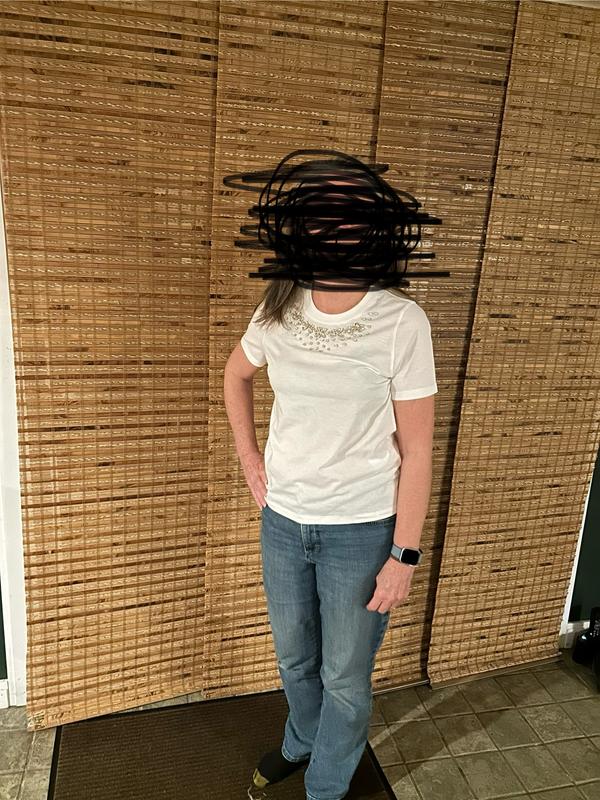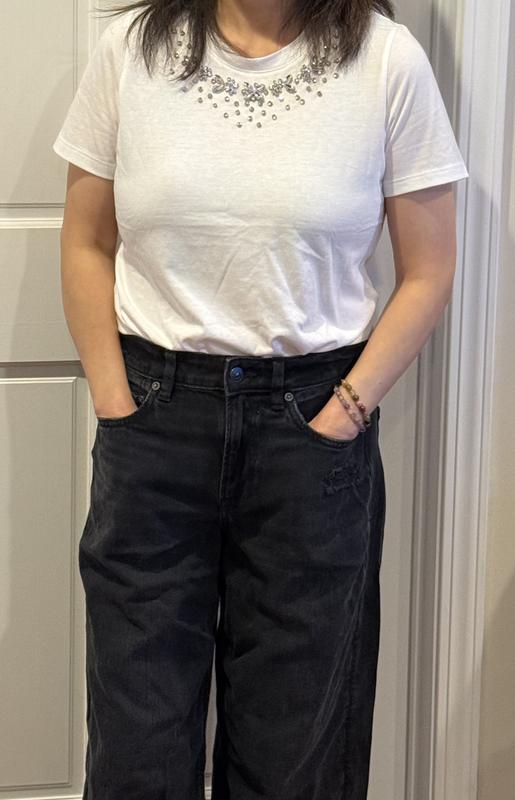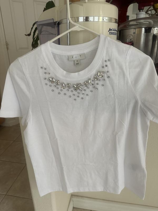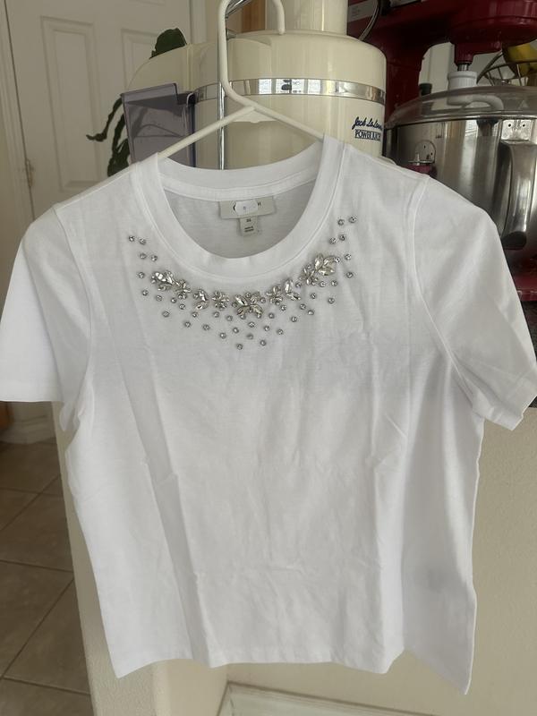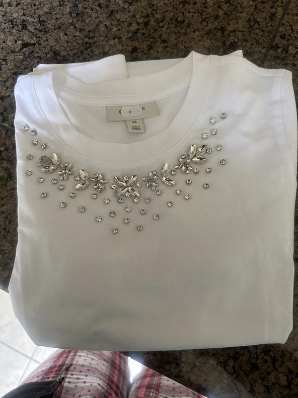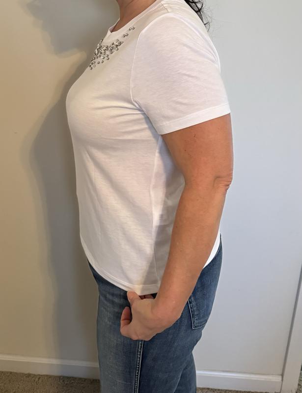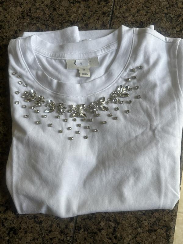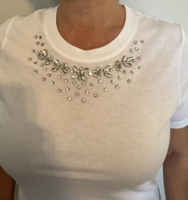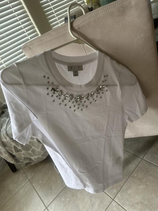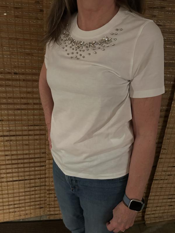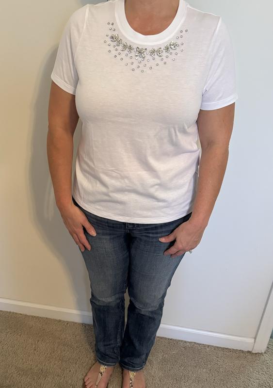 Love this embellished top. Quality feels great and can dress up my jeans for a casual yet classy outfit.