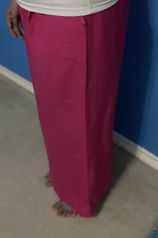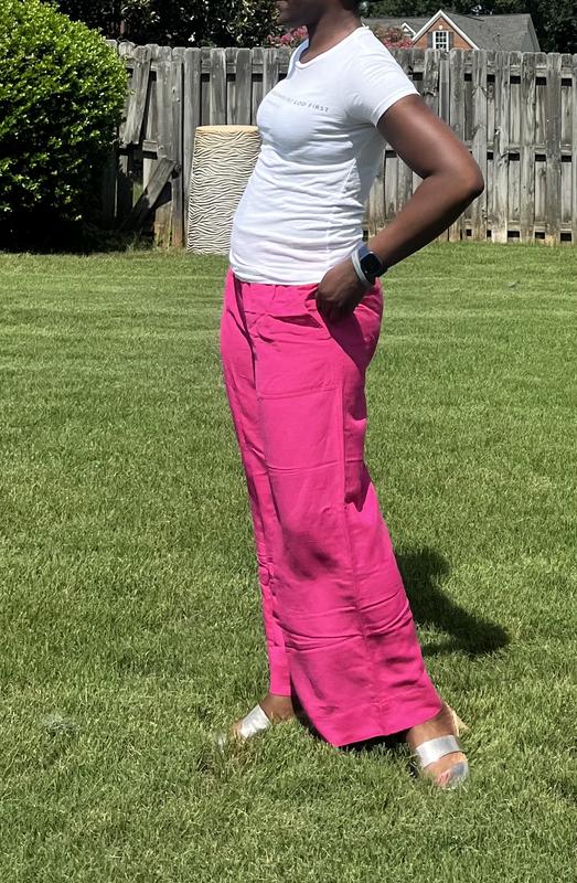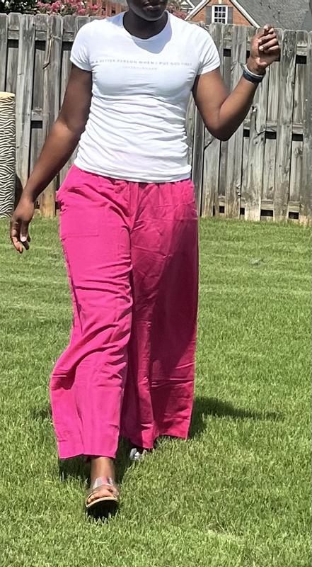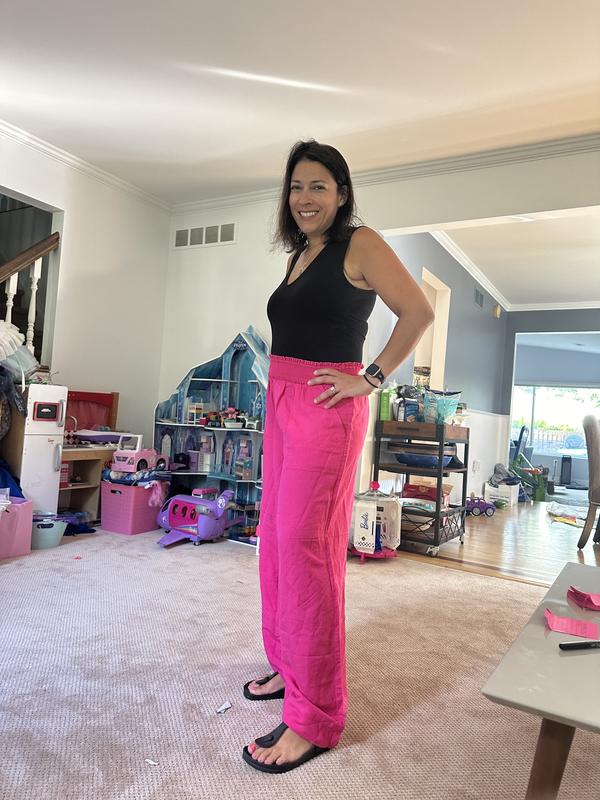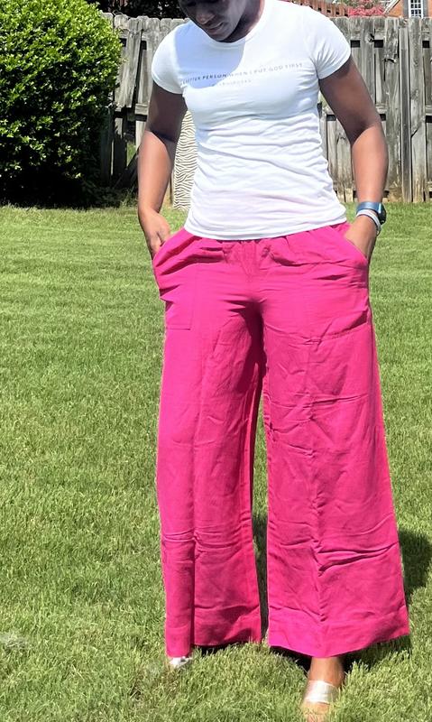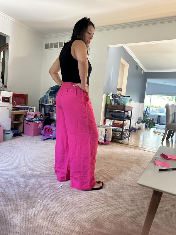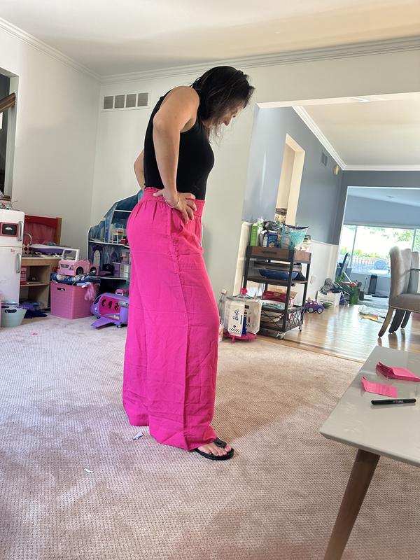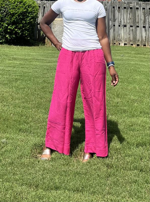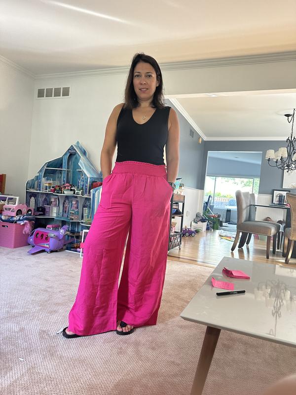 Absolutely love these linen-bland high-rise wide-leg pants! I'm 5'1 and wore them with 3 inch high sandals. I'll definitely need to get them hemmed to wear with flats. These pants are breathable and the elastic waist makes these non-restricting pants a closet must have! The high waist creates a really nice silhouette without sacrificing comfort. And did I mention there are pockets?! Perfect for slipping in your iPhone. I paired it with a Bar III white bodysuit. The hot pink color is bright, pops and will also look great with a black top.