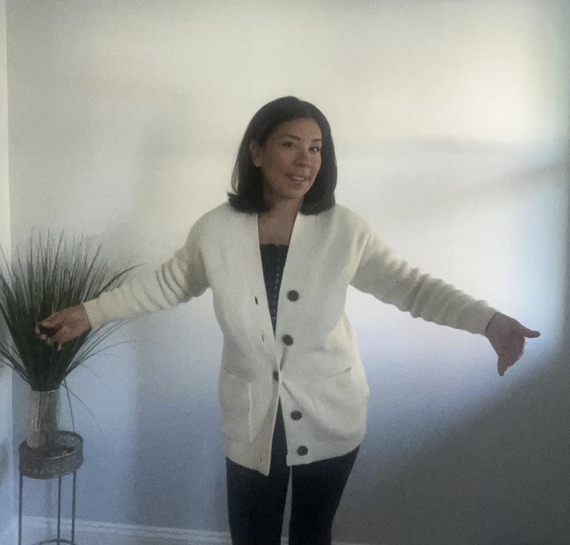I’ve recently started wearing button down cardigans as a top (nothing underneath) . This light gray soft cardigan is just right. The sparkles add special occasion vibe or just a bit of pizzaz for everyday wear. The sale price was just right. One note: I’m usually a size Medium but sized down to Small and it’s good to wear either over something or without .