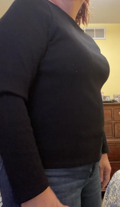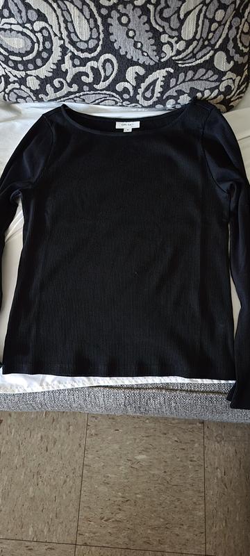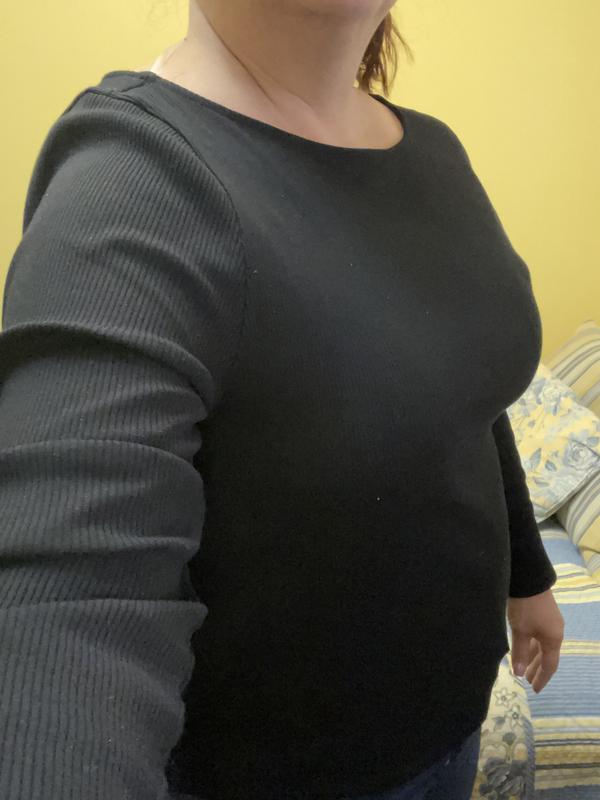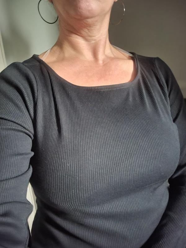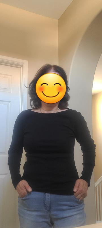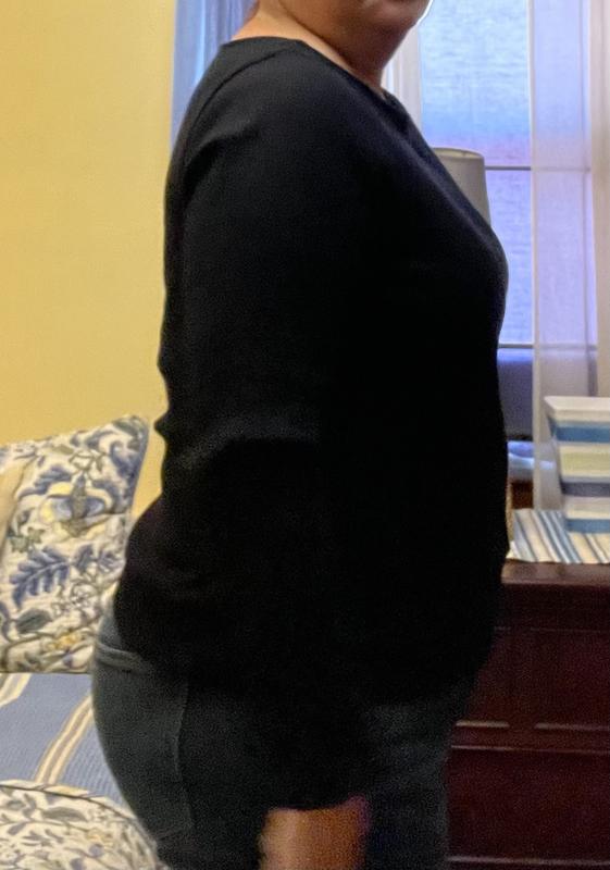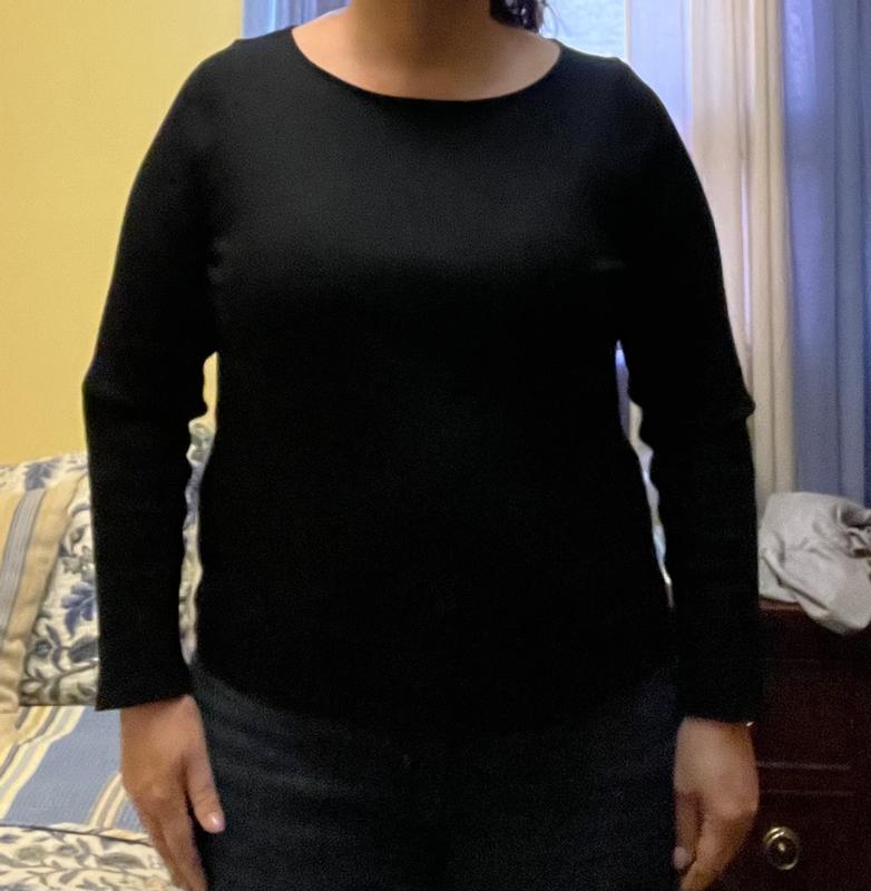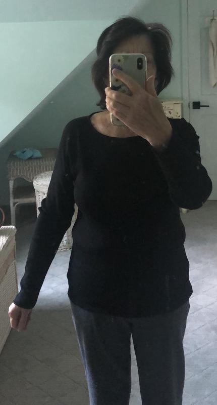 Black fitted shirt. Love the color. Great material, really soft and comfortable and very flattering. Can wear casually or dress up for date night. Looks like it will wash well and go back into shape after wash. One of my new favorite tops!