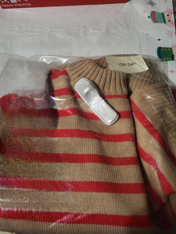 I got the tan and red stripe—so cute. Love the thick rib cuffs and neck line. Just the right slightly cropped length.