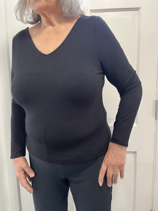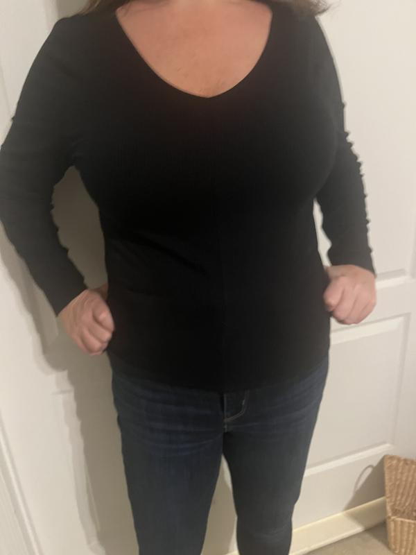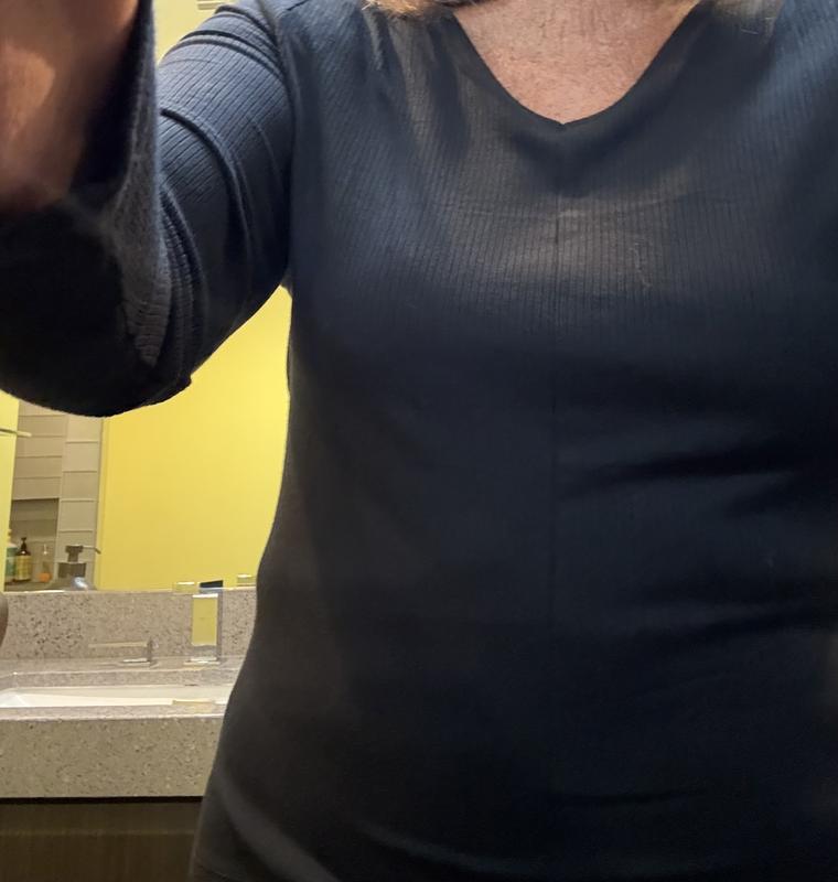 I love the v neck front AND back, that it is a little too clingy for my taste. Every lump and roll shows. It is more of a sweatery fabric than a t shirt. If you are slim and looking for a light weight sweater, this may work great.