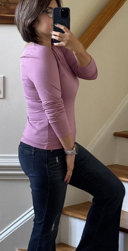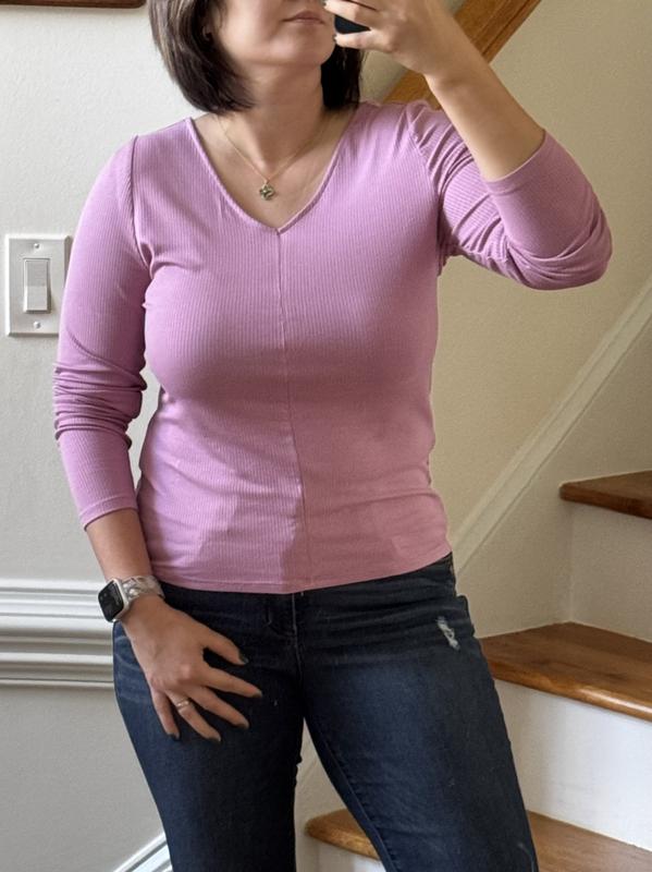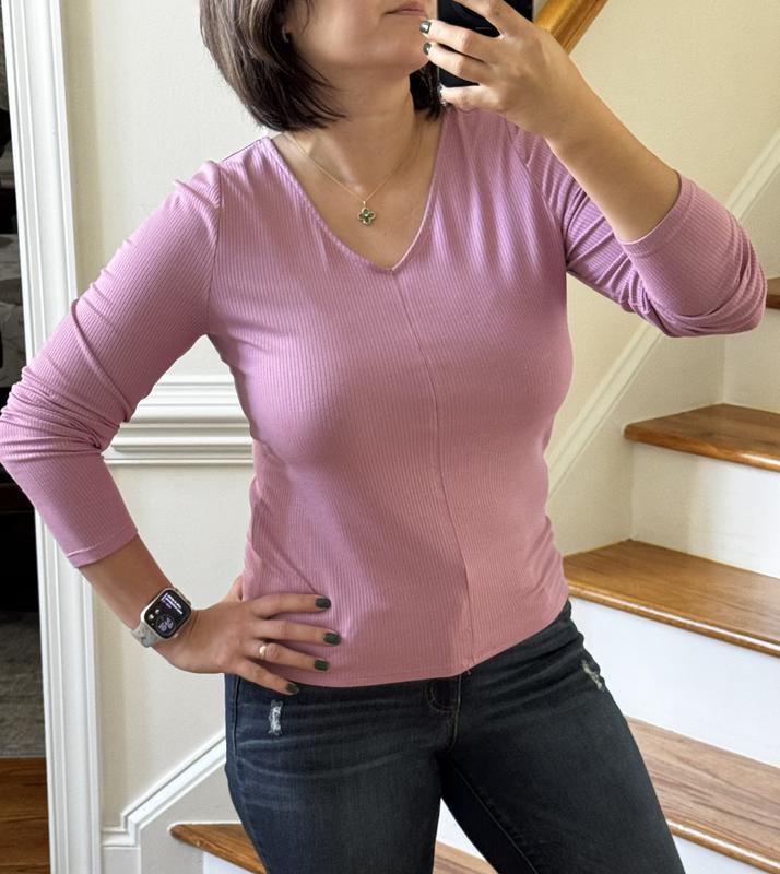 The Double V Tee in the mauve orchid color is absolutely gorgeous! The shade is vibrant and versatile, adding a stylish touch to any outfit. The fabric is soft, light, and thin, with just the right amount of stretch for a comfortable fit. It pairs perfectly with anything—jeans for a casual look or a skirt for something more dressed up. A great wardrobe staple!