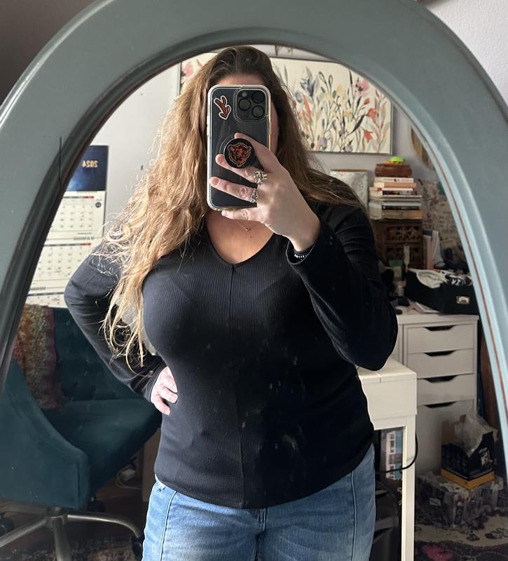 This is a comfortable knit top. The material is soft with a little bit of give. This shirt is fitted and fits true to size. I am wearing a large. It can be worn by itself or layered. The shirt can be dressed up or down. I paired it with a shacket and black leggings. I have also worn it with jeans by itself for a more polished look. The options are endless.