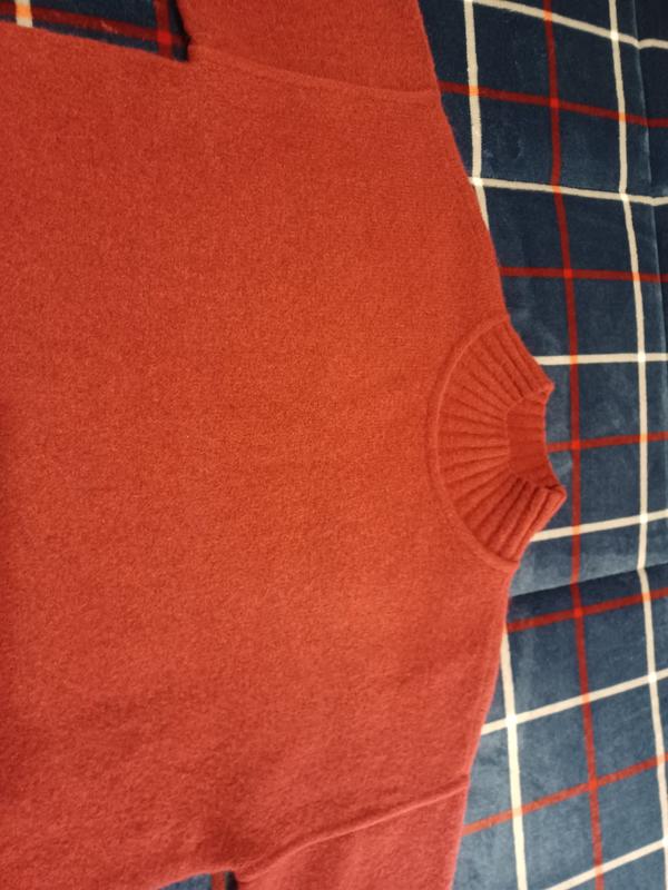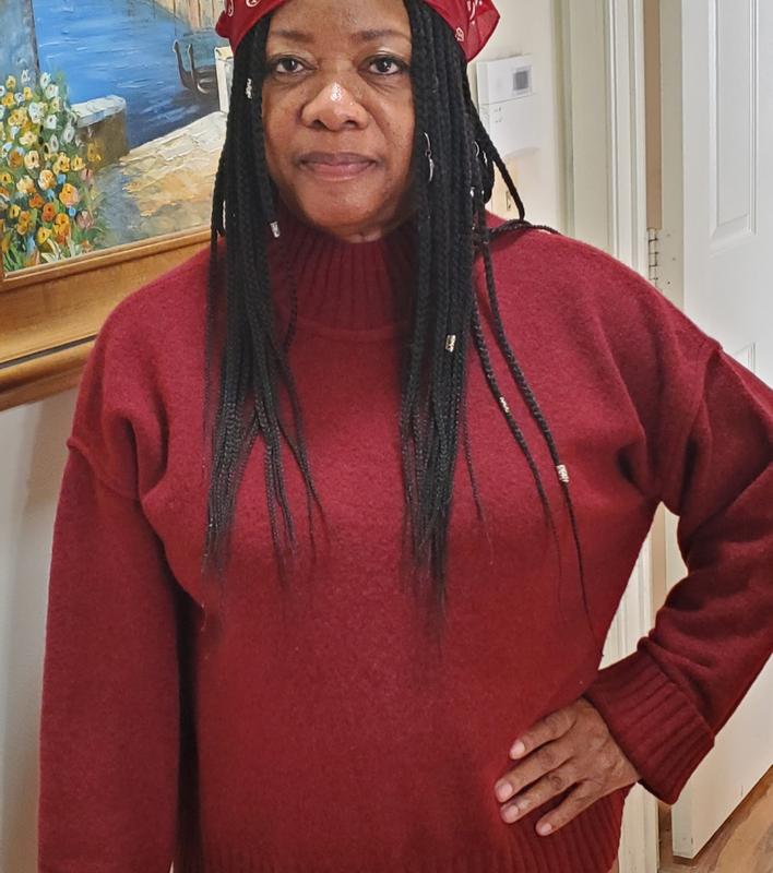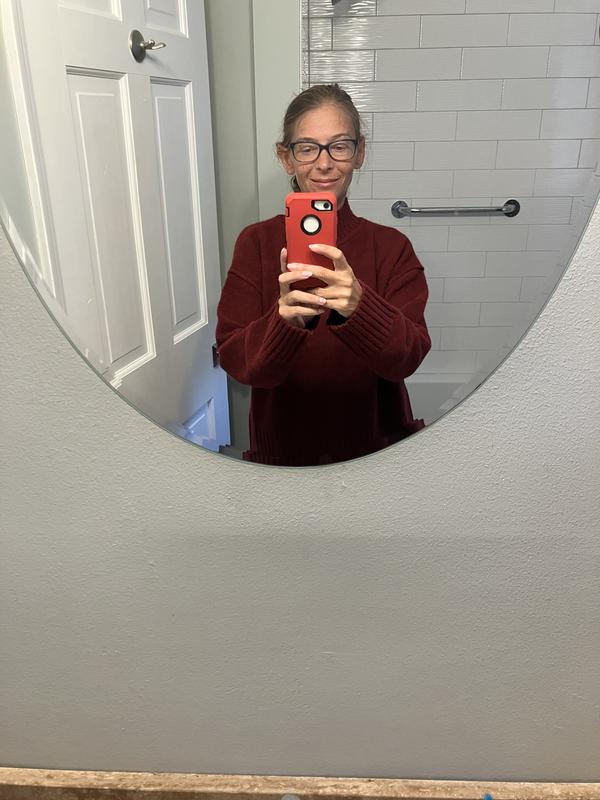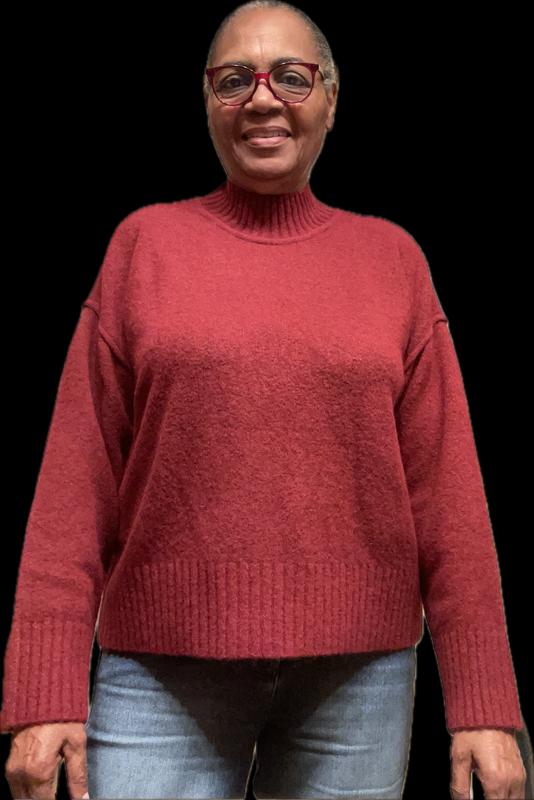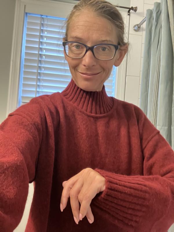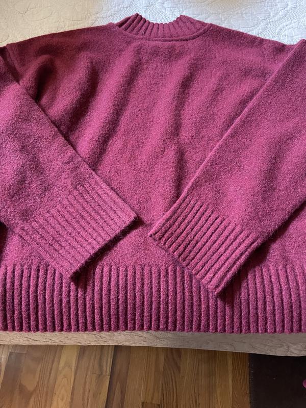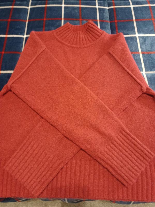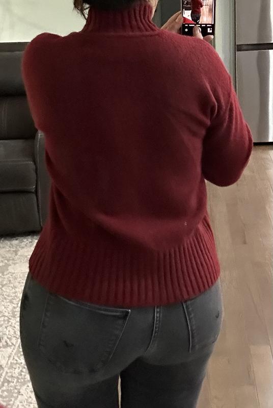 I love this Mock-Neck Jersey Roll-Trim Sweater ! It has beautiful soft color and trendy style ! Very happy with it!