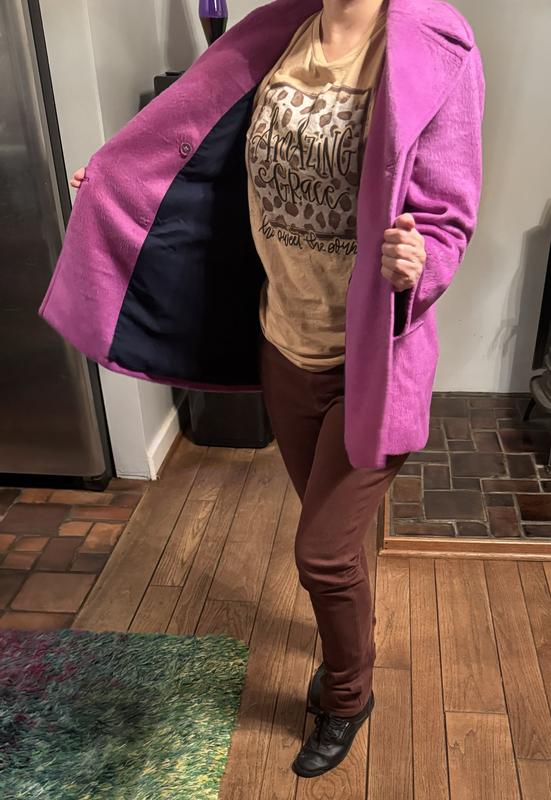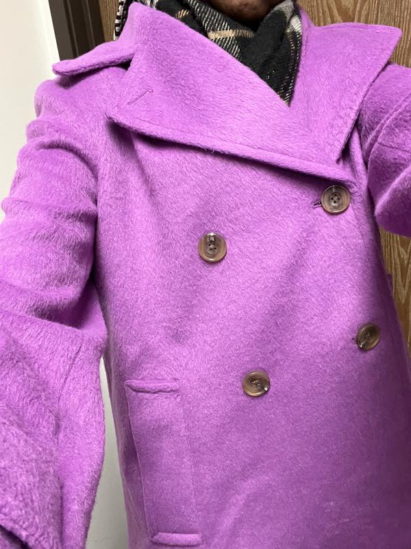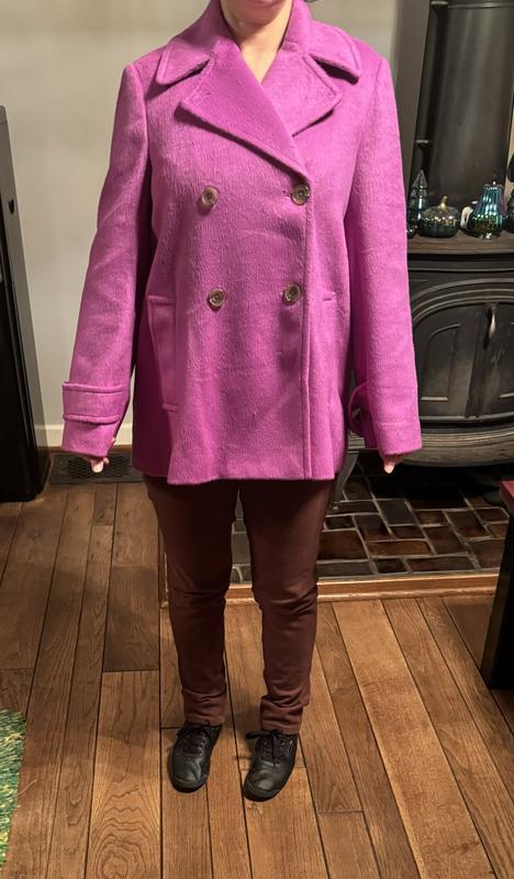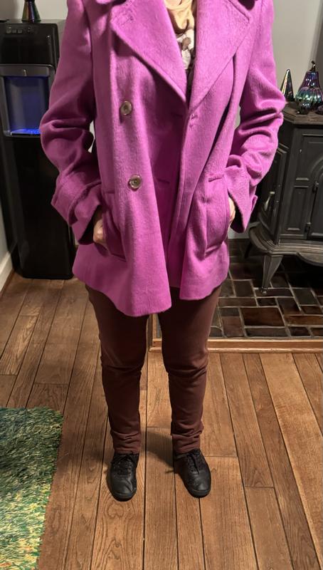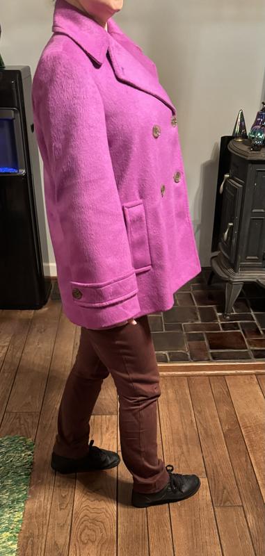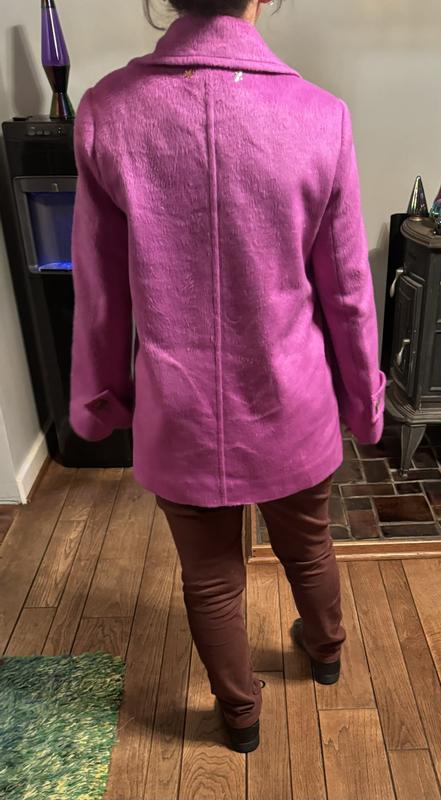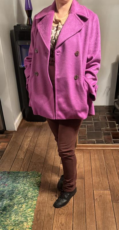 Oh my gosh, the color and fabric is hideous. The on-line picture looks like the coat is pink! Well it's a hideous color of purple. Not Purple rain Purple but an ugly purple. The fabric. OH MY.. it's more of a fleece type of fabric. NOTHING Peacoat about it. Back to Macy's this coat goes.
